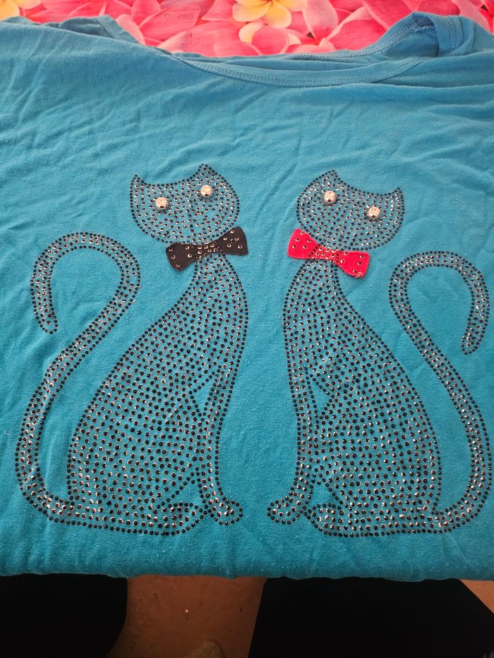 Thee shirt coton extensible , epaule ouverte de chaque cote avec perles , motif au centre avec strass de 2 chats couleur bleu