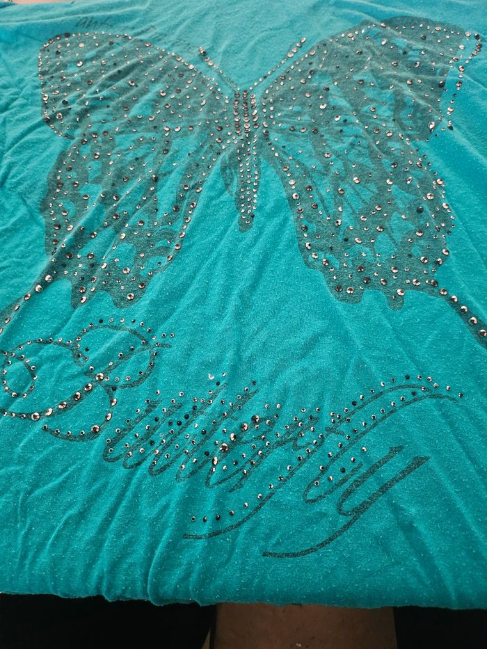 Thee shirt coton extensible , epaule ouverte de chaque cote avec perle , motif en strass couleur vert