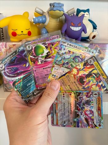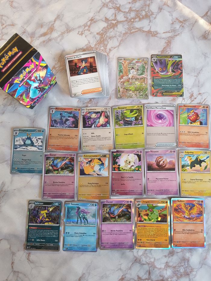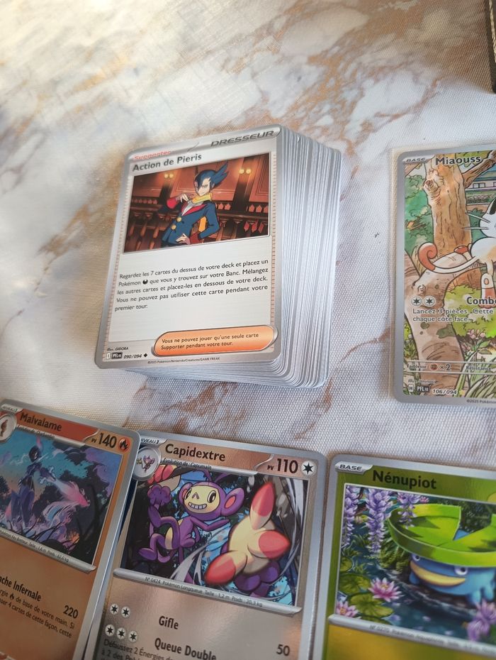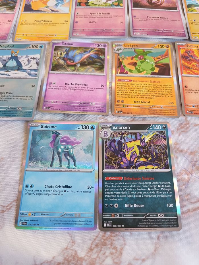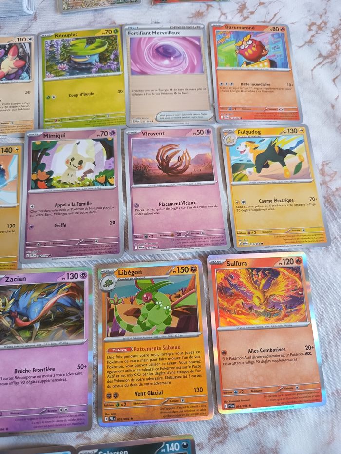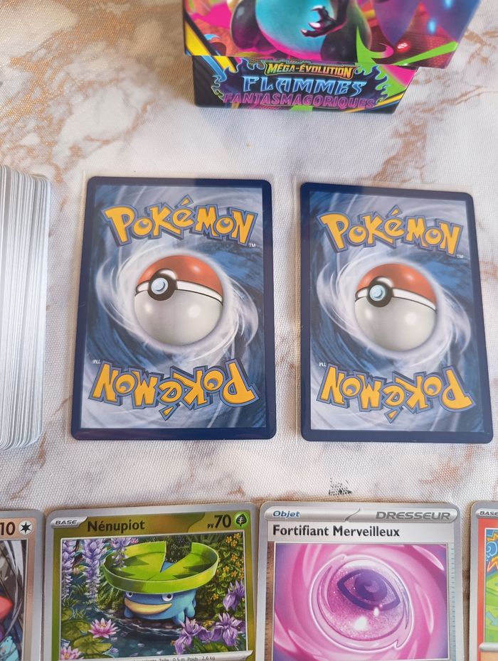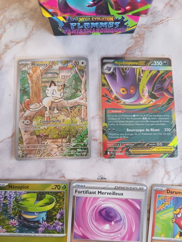 Lot de cartes Pokémon Flammes fantasmagoriques Sorties de booster 11 reverses , 5 Holo ainsi que mega ectoplasma ex et miaouss 106/094