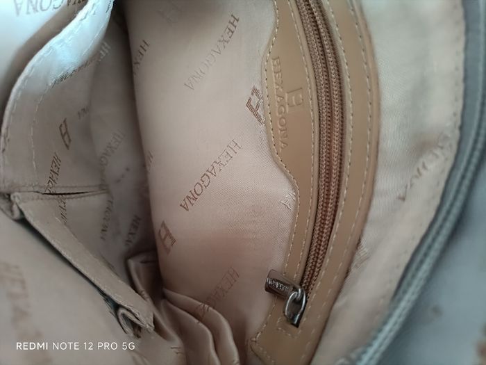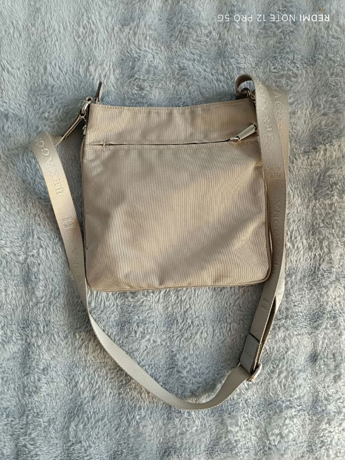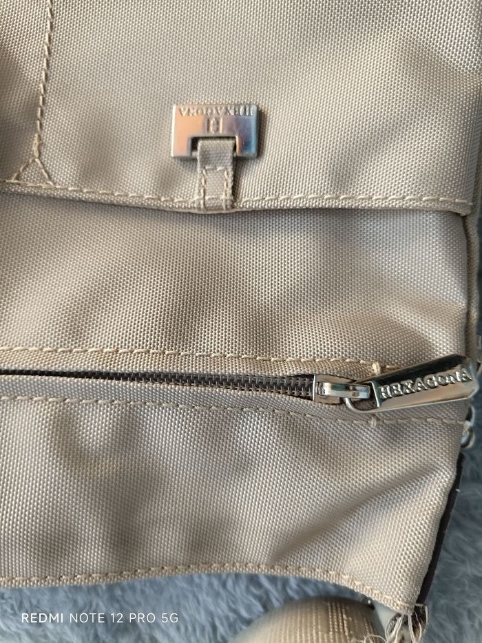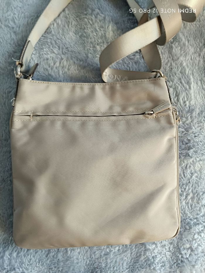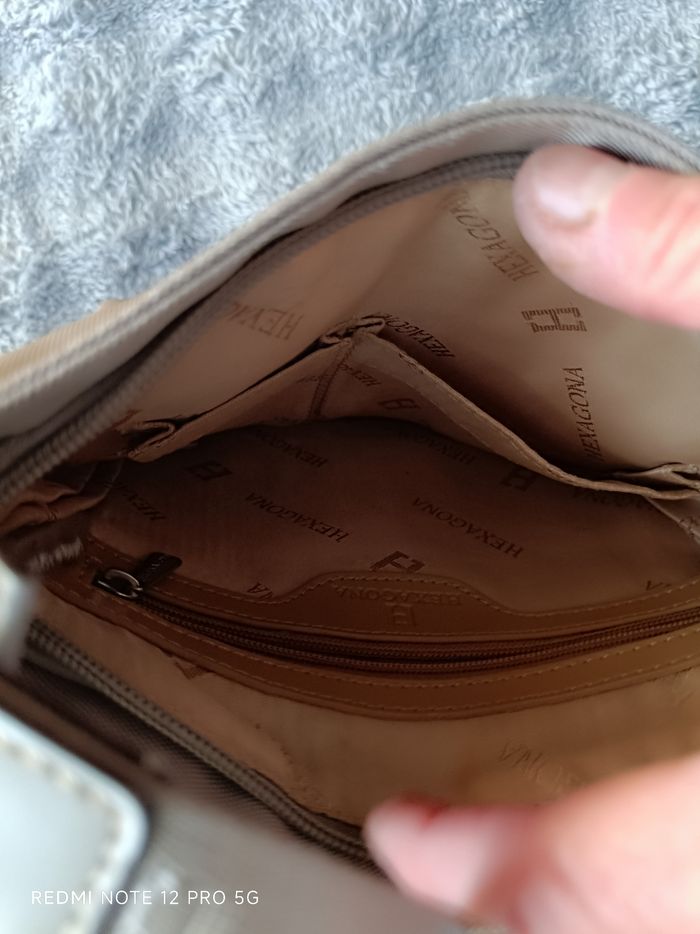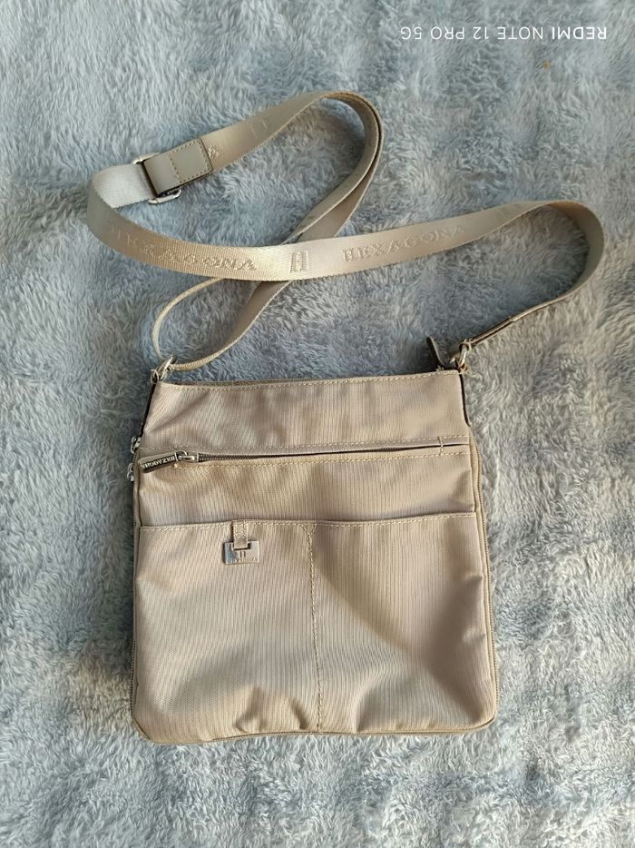 pochette- sacoche beige Hexagona toile hybride avec 3 poches à fermeture font 1 devant + 1 derrière et la grande du milieu soit 3 poches intérieures dont 1 zippée