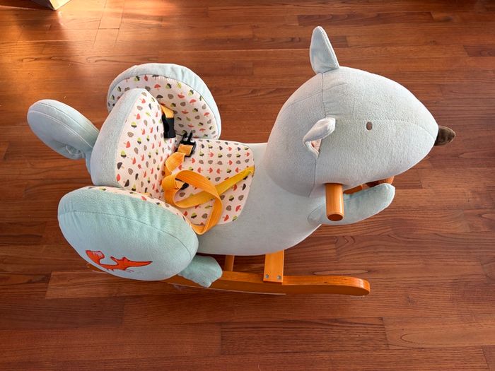 TBE a bon état car l’embout de la ceinture noir est. cassé Personnellement je n’attachais pas mon fils car j’étais à côté et il était sur un tapis wesco.
