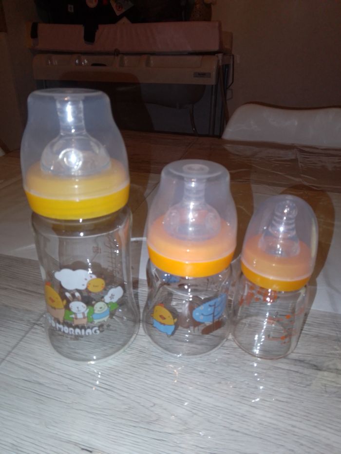 Lot de 5 biberons jamais servi : 3 biberons en verre et deux petits biberons en plastique