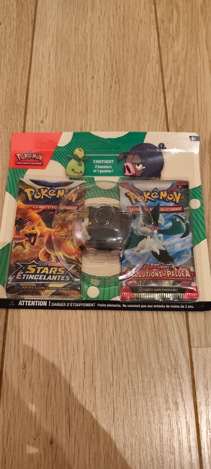 Duo pack pokemon gomme Contient : 1 booster stars étincelantes dracaufeu, 1 booster ev2 et une gomme gourmelet le tout avec opercule