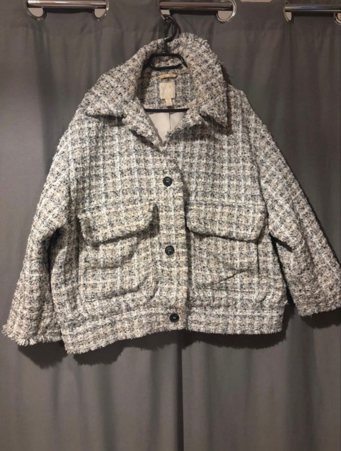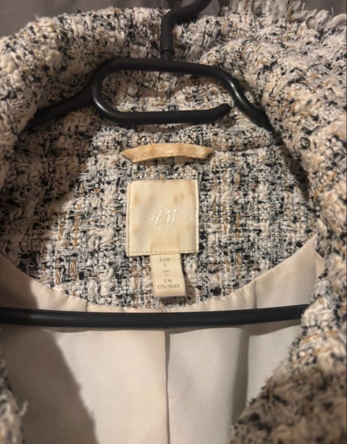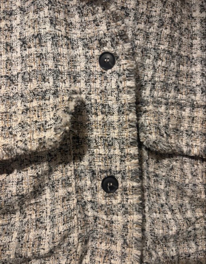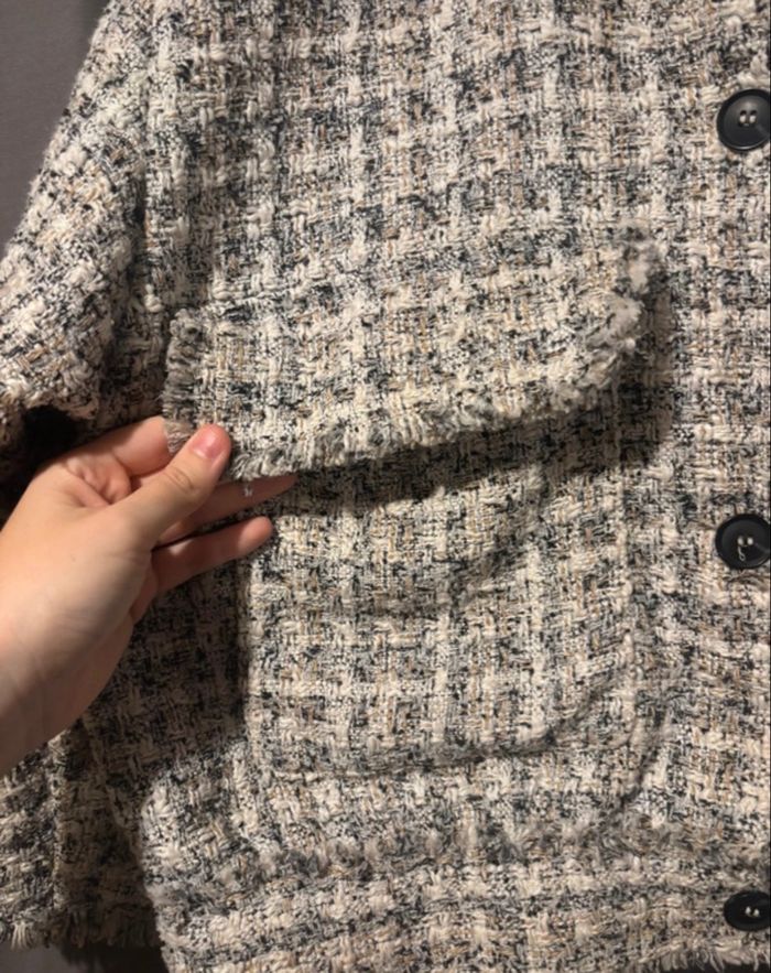 Veste / manteau tweed – Taille L Très jolie veste coupe courte en tissu tweed / bouclé, style chic et intemporel, inspiration “Chanel”. Couleur écru, gris et noir, facile à assortir. Modèle assez épais, parfait pour la mi-saison (printemps / automne) ou en hiver avec un pull. Deux grandes poches sur la poitrine, fermeture à boutons sur le devant. Coupe légèrement oversize selon le rendu. État : bon état général. À noter : une petite tache au niveau du col à l’intérieur du manteau (non visible porté). Effet légèrement effiloché sur les bords, normal pour le tweed. Couleur : écru / gris / noir Style : chic, parisien, preppy Envoi rapide et soigné 📦 N’hésite pas si tu as des questions !