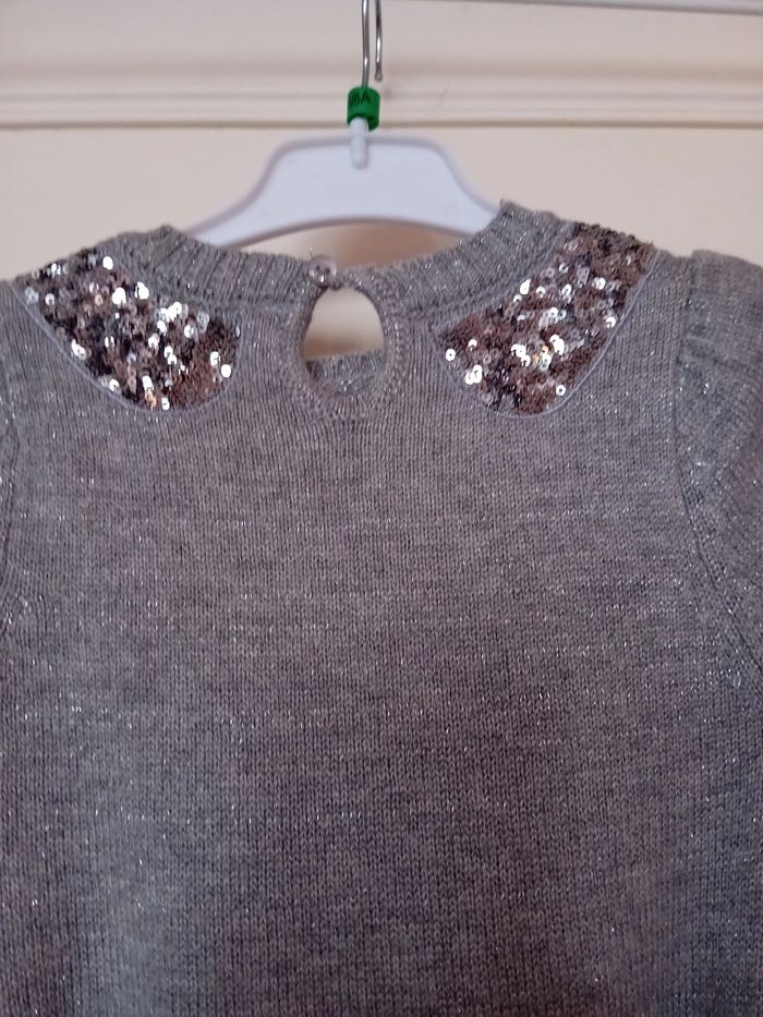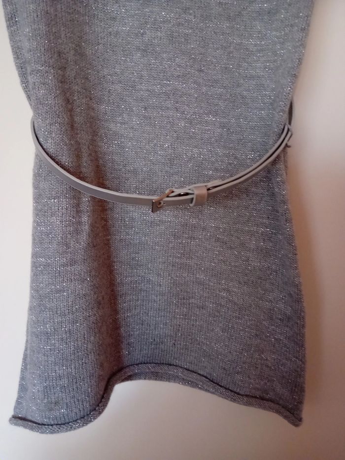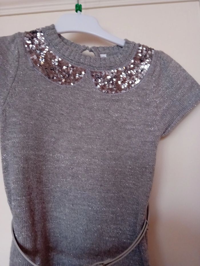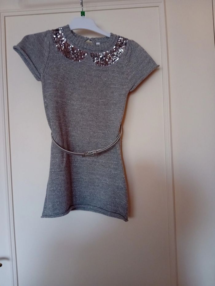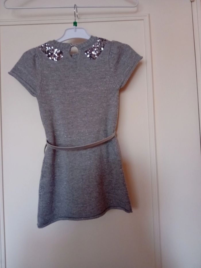 Robe manches courtes - Taille 3/4 Ans - Coloris gris avec incrustations argentées - Ceinture amovible - 43% Viscose 30% Laine 24% Polyamide 3% Fibre métallique - Lavable à 30° - Très bon état - Livraison ou remise en mains propres sur Paris - Je vends la même robe en taille 13/14 Ans.