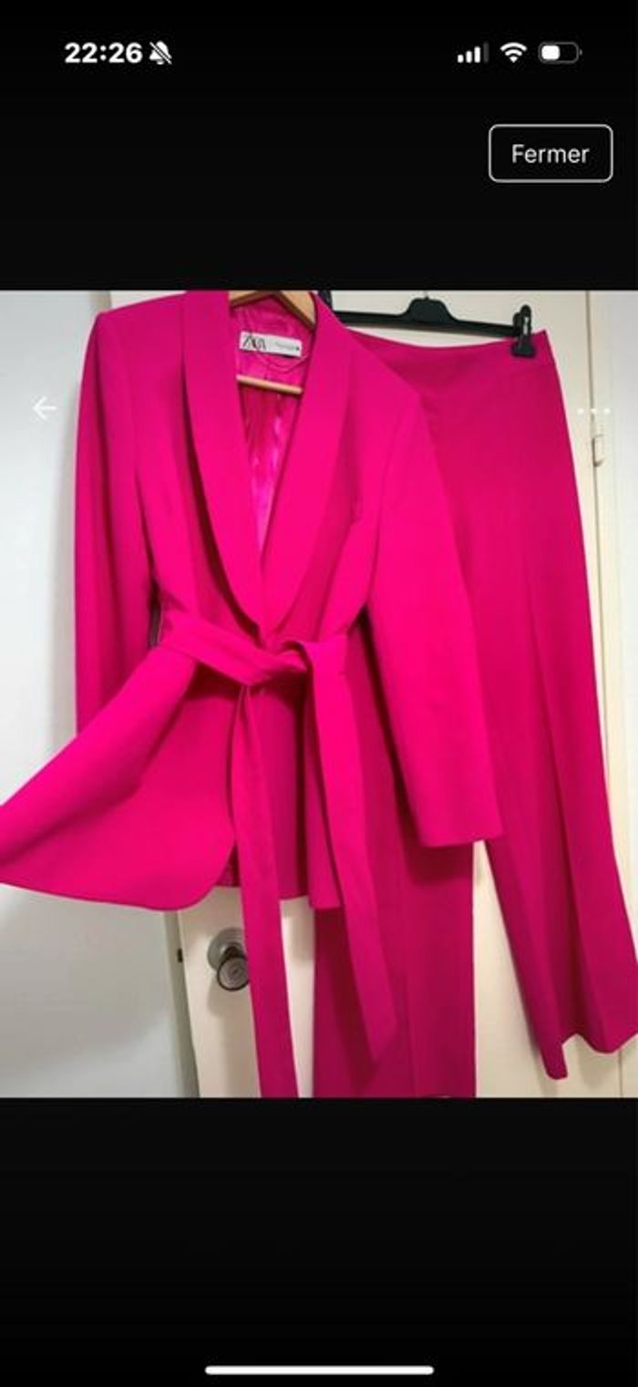 Magnifique tailleur blazer pantalon fushia neuf porté un fois .tailleur pouvant se porter décontracté avec des baskets et aussi habillé avec des talons .ideale pour les fêtes de fin d’année .prix en magasin 120€