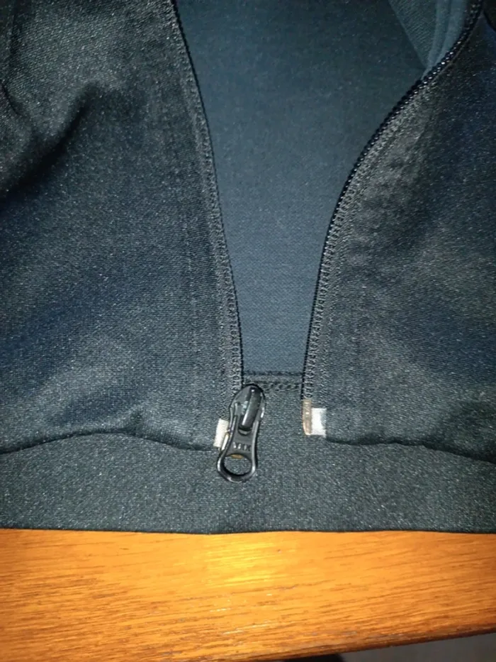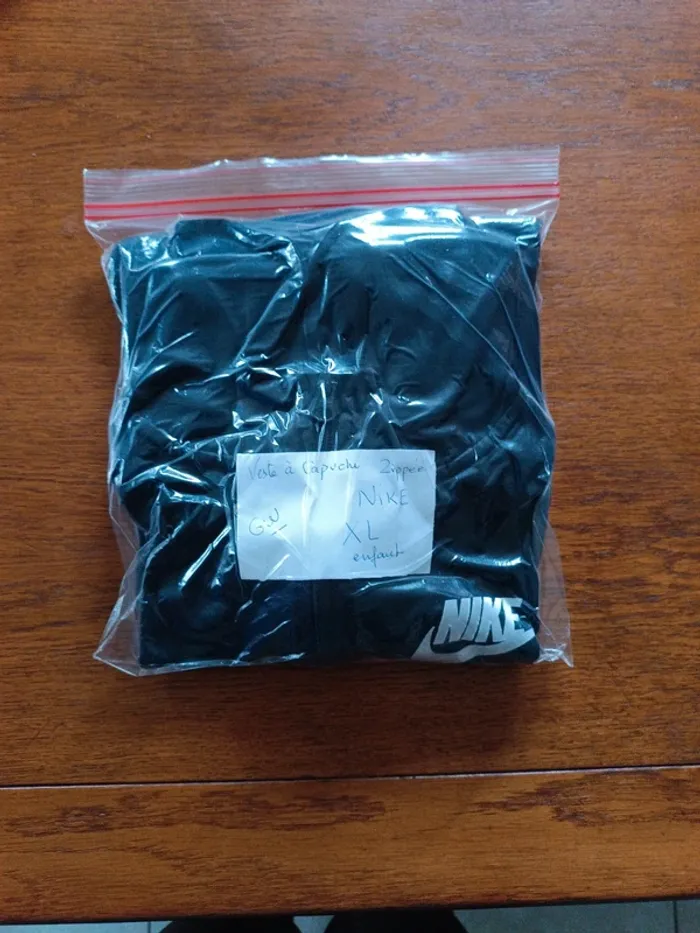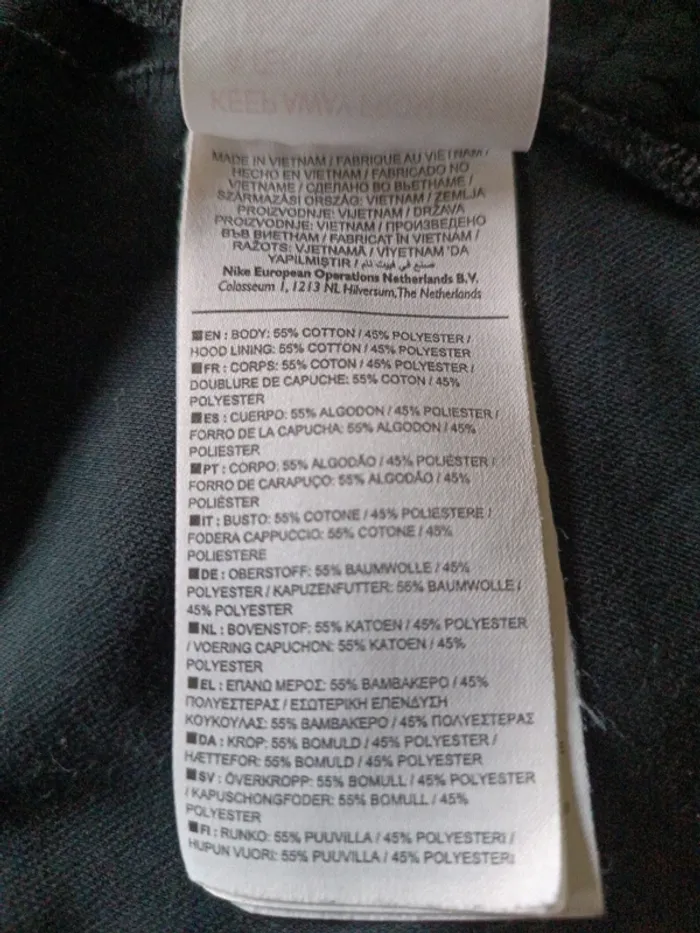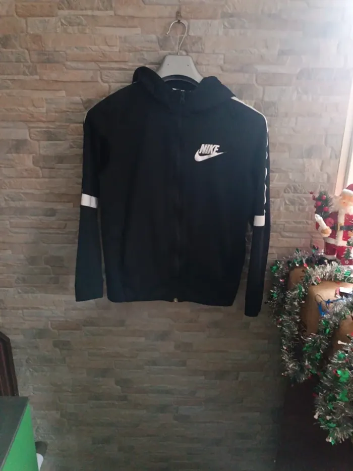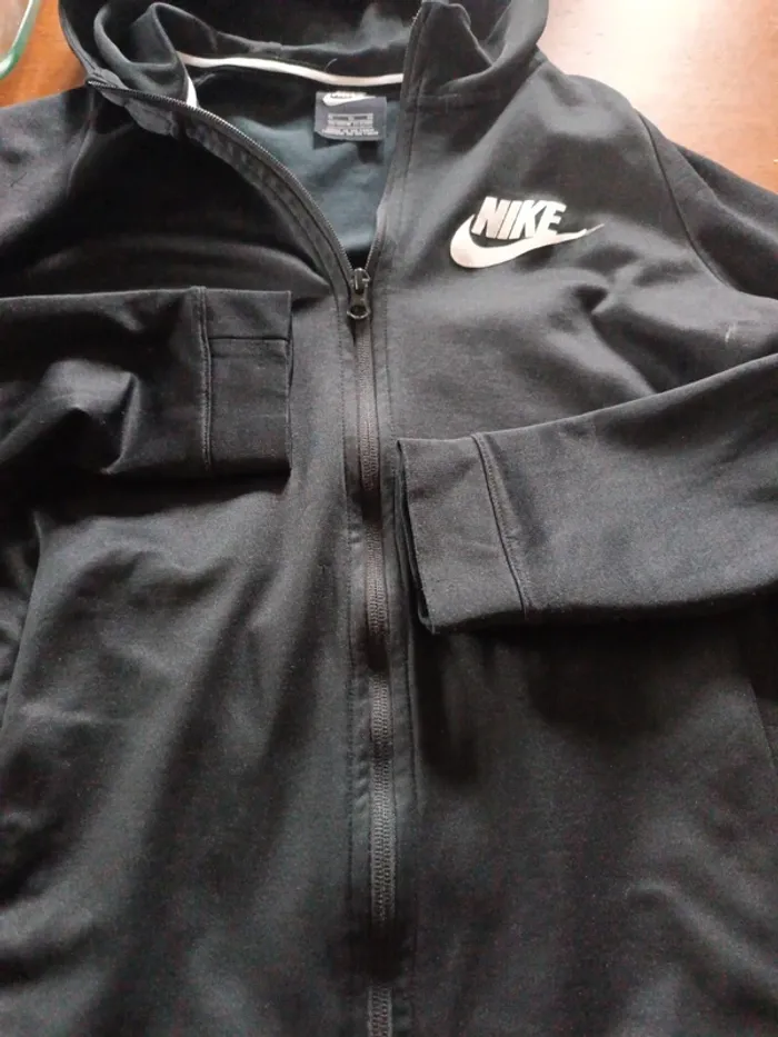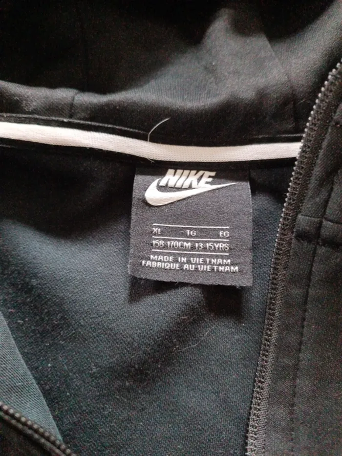 Veste à capuche noire Nike XL enfant. Aisselles 48 cm. Longueur 56 cm. Manches raglan 62 cm. Aérations aisselles. 65% coton, 45% polyester. TBE