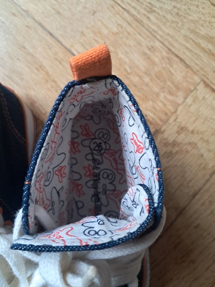Style :Type "Converse "avec lacets blancs et œillets orange.