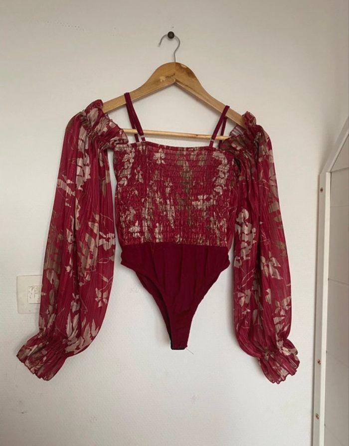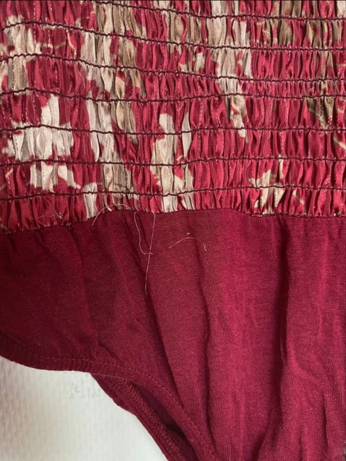 Je vends ce haut femme en viscose de couleur rouge bordeaux avec un imprimé fleuri.