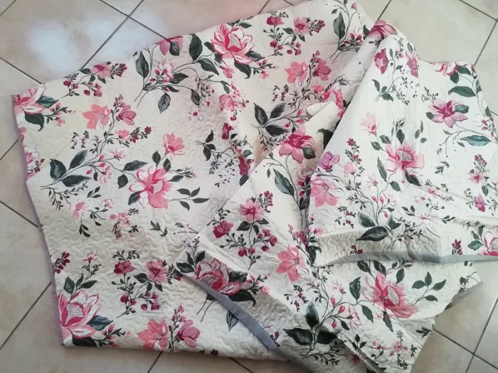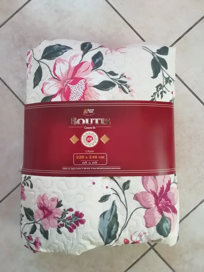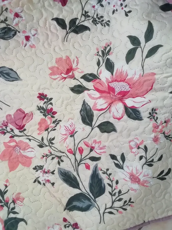 A MOTIFS FLORAUX COLORES (autre dans l autre face, voir dernière photo). LEGER. POUR LIT DE 2 PERS : TAILLE env 210 X 230cm (et non pas 220 x240xm comme noté sur le bandeau de l emballage) AVEC DEUX TAIES POUR OREILLERS CARRES DE env 60cm DE COTE(et non pas 65 x 65cm comme noté sur le bandeau de l emballage). NEUF JAMAIS SERVI, DONC IDEAL CADEAU!!
