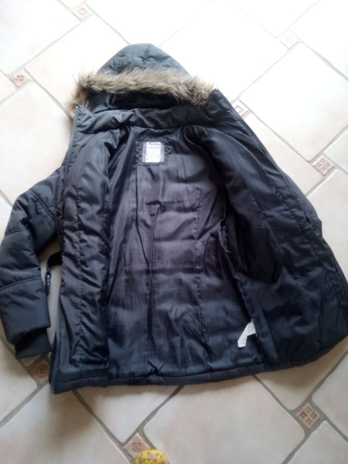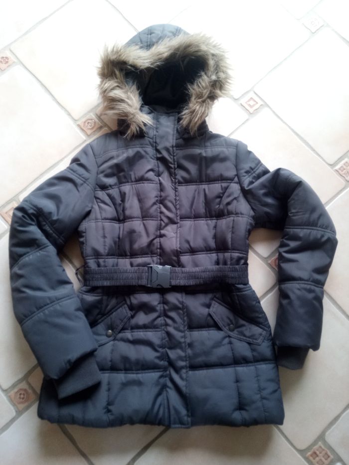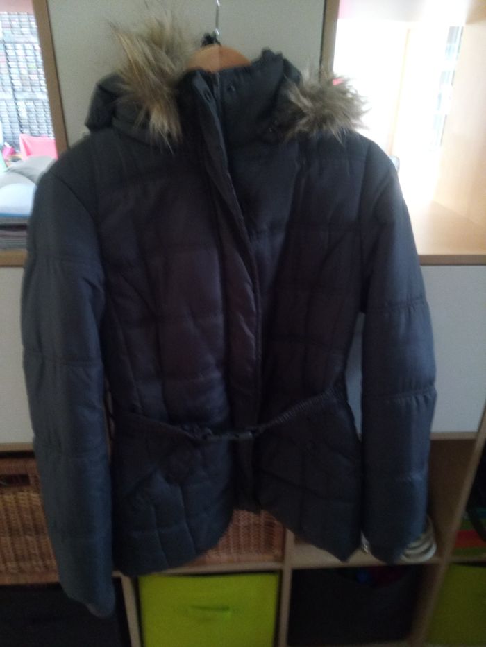 Blouson Gris foncé taille 42 La capuche se détache fermer par une fermeture et des pressions et une ceinture. Il est en bon état ( Le manteau n'est pas tâcher flach de l appareil)