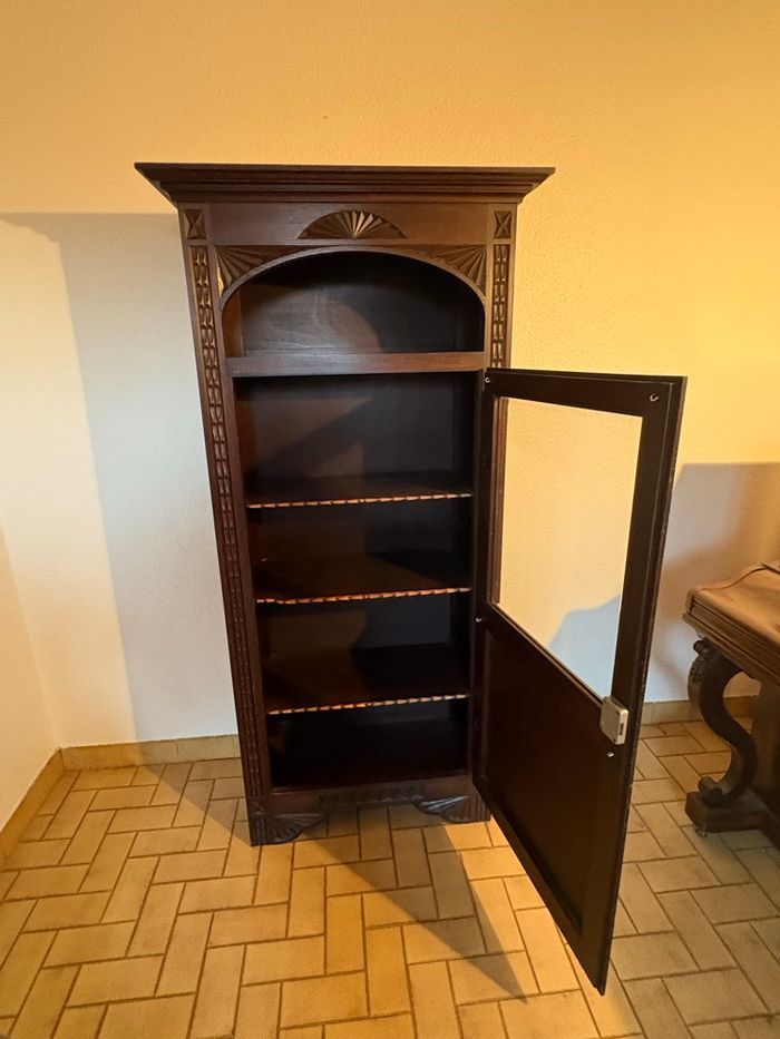 Armoire ancienne, bois , avec porte vitrée et étagères, très bon état.