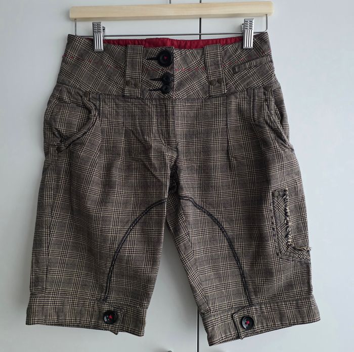 Pantacourt de marque IKKS, taille 36, 74% coton, 25% polyester, 1% métal. Dans les tons beige / noir / fils dorés, 2 poches avant, 2 poches arrière, passant pour ceinture. Mesure taille: 36cm Entrejambe: 29cm Longueur: 51cm