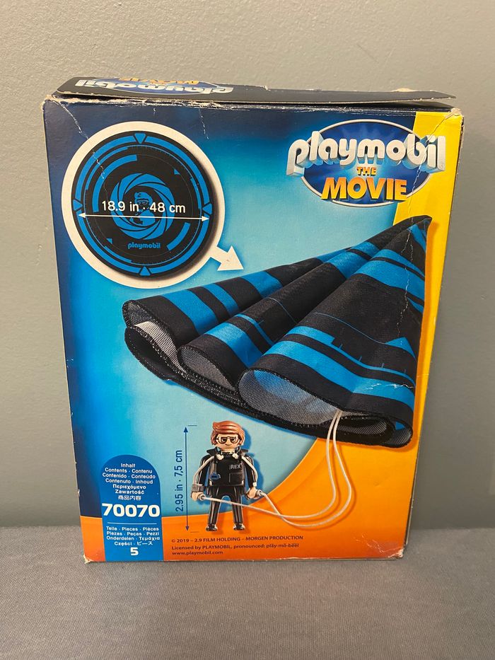 Rex Dasher avec parachute 70070 Playmobil The Movie Attention en dessous ! L'intrépide Rex Dasher saute d'un avion avec style et sans se soucier du vide grâce à son parachute. Le parachute redescend doucement vers le sol lorsqu'il est lancé dans les airs. Diamètre Parachute : 48cm- Le parachute redescend doucement vers le sol lorsqu'il est lancé dans les airs.- Le personnage peut être accroché au parachute Complet Vendu dans son emballage d'origine un peu abimé Acheté 13€00