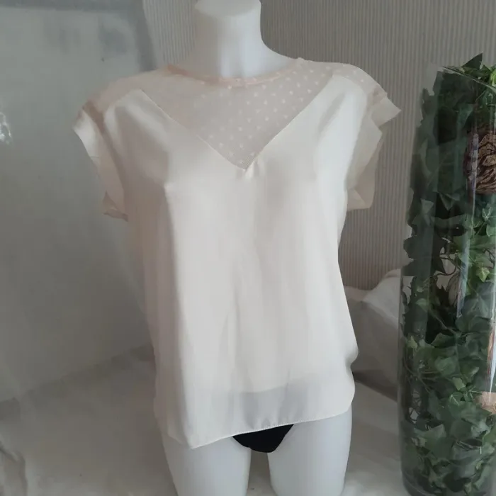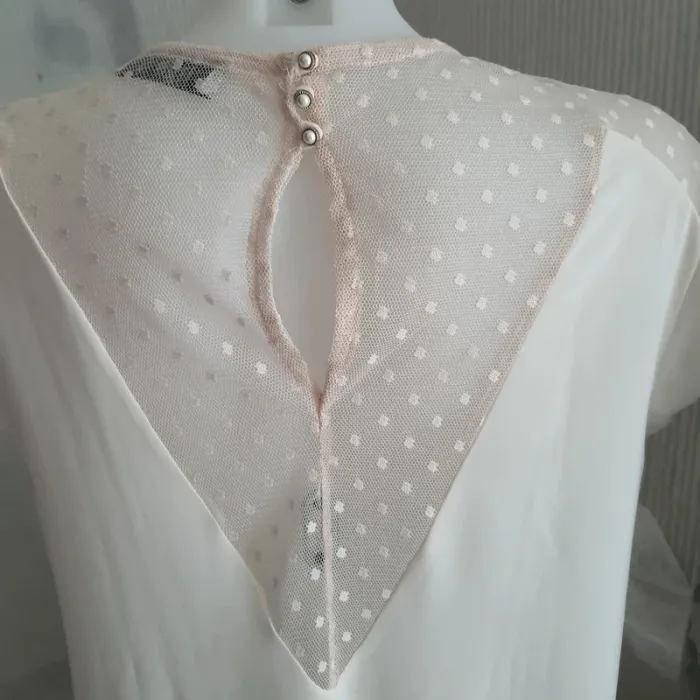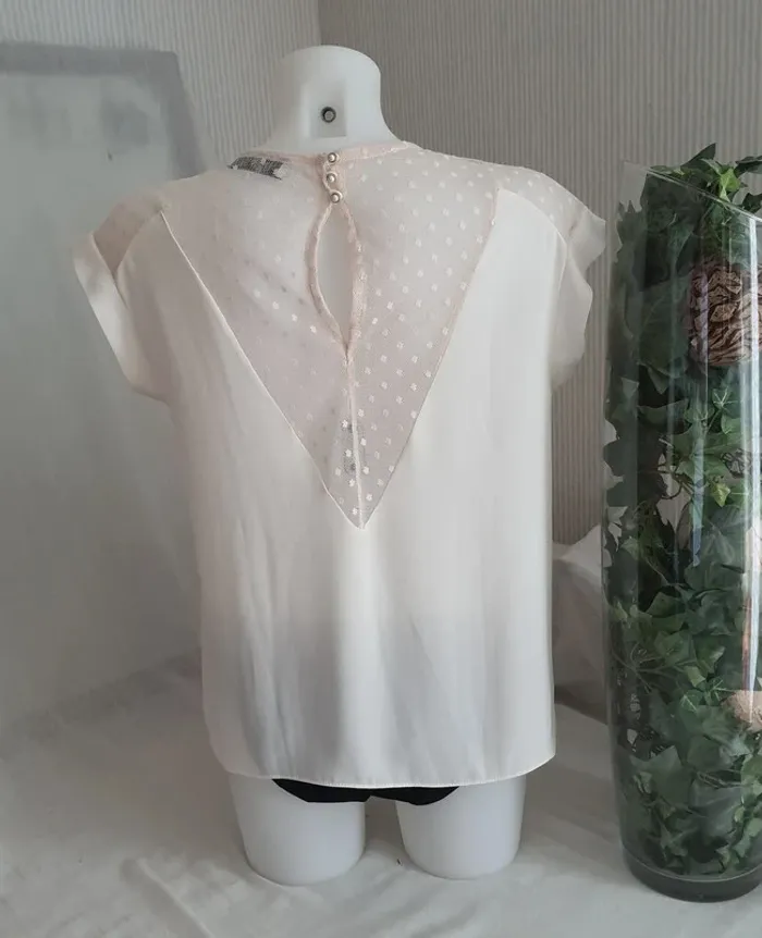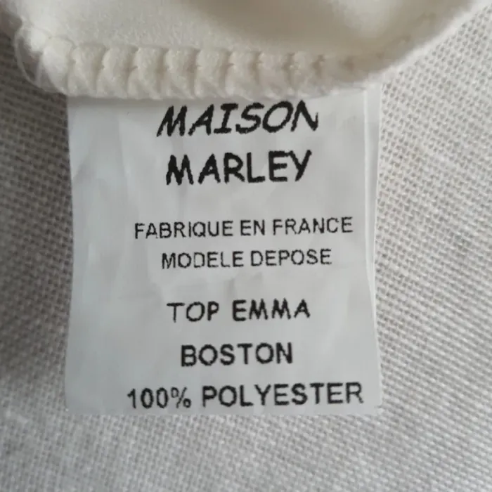 Top #Maison Marley, modèle Emma Boston 100% polyester, taille M, dentelle, fabrication Française 3 boutons au dos Dimensions à plat: sous aisselle 46 cm., hauteur 62 cm.