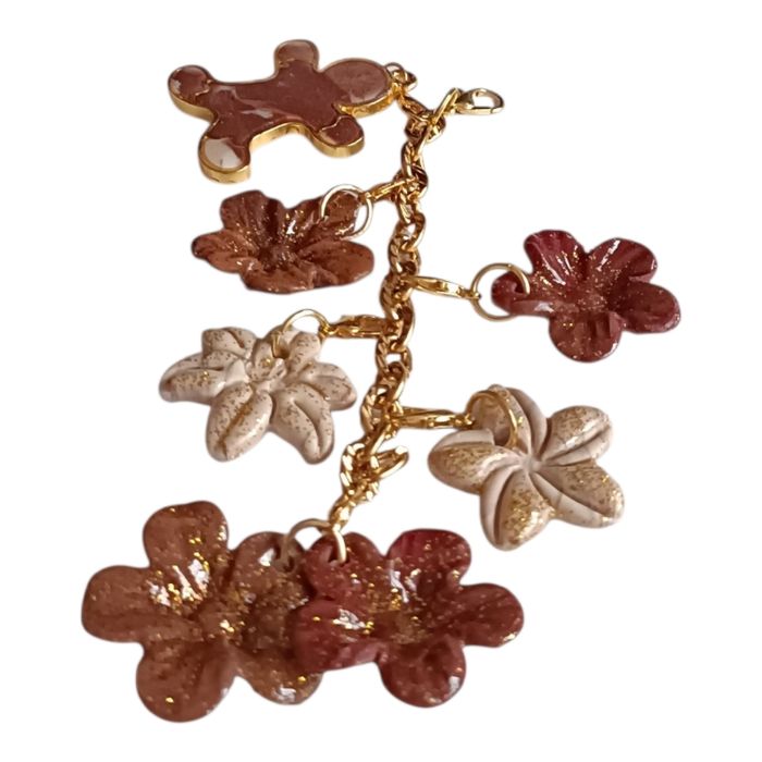 parce qu’on sait que les détails font tout, on lui a ajouté notre bijou porte-clés exclusif réalisé entièrement à la main en pâte polymère : un adorable bonhomme pain d'épice  entouré d’une cascade de fleurs délicates dans les tons marron , doré et blanc cassé. Chaque pièce est unique (légères variations possibles, c’est le charme . Ensemble  Chaine, les charms et anneau pour accrocher à la sangle du sac  Couleurs : marron, blanc beige, doré  Charm bonhomme pain d'épice pâte polymère  Fleurs différentes formes  Création pour femme  Vernis résine UV  Pas laisser à la portée des enfants  Le sac pas vendu avec Frais de livraison 3€90 lettre verte avec suivie