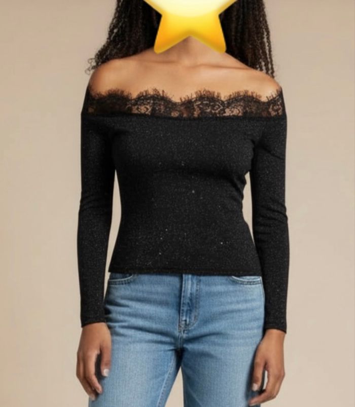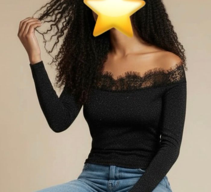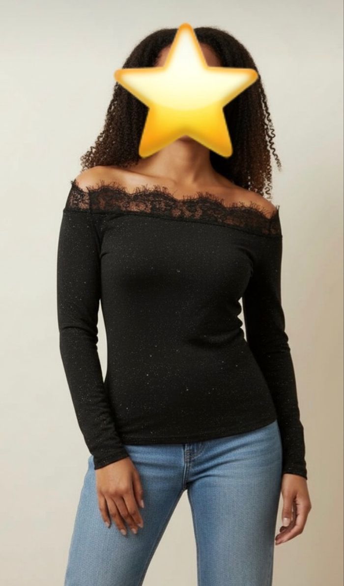 haut noir femme, top noir, haut dentelle, top dentelle femme, épaules dénudées, haut chic femme, top soirée, haut manches longues, vêtement femme noir, tenue élégante femme