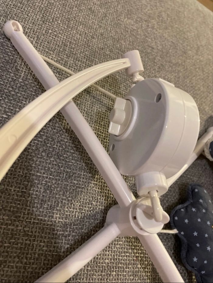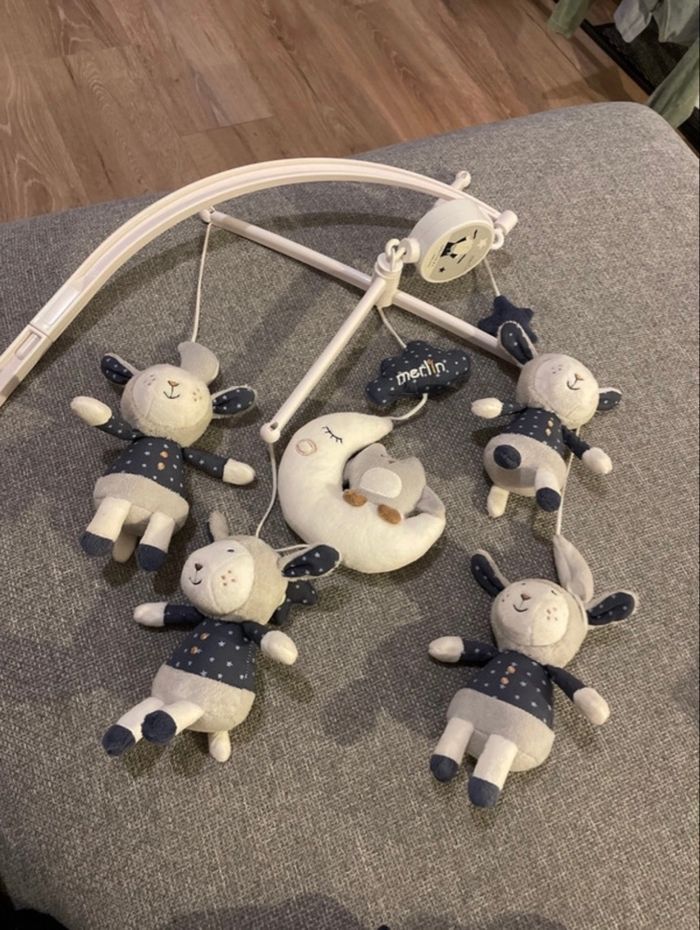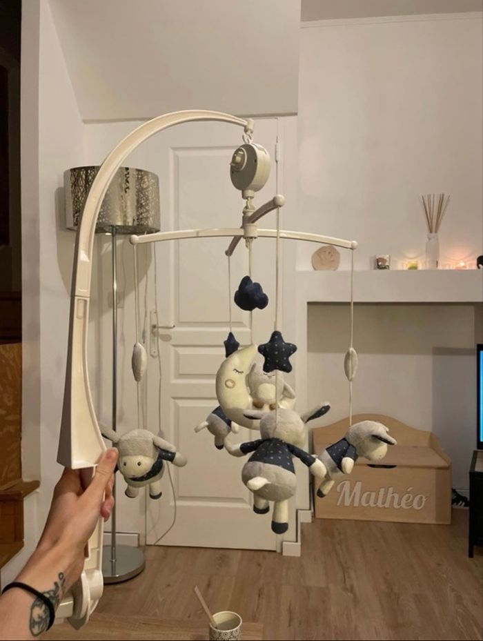 Mobile bébé Merlin SAUTHON très bon état Blanc et bleu, musique fonctionnel, 4 moutons avec lunes et étoiles autour d’une lune avec un hibou et un nuage. 10€