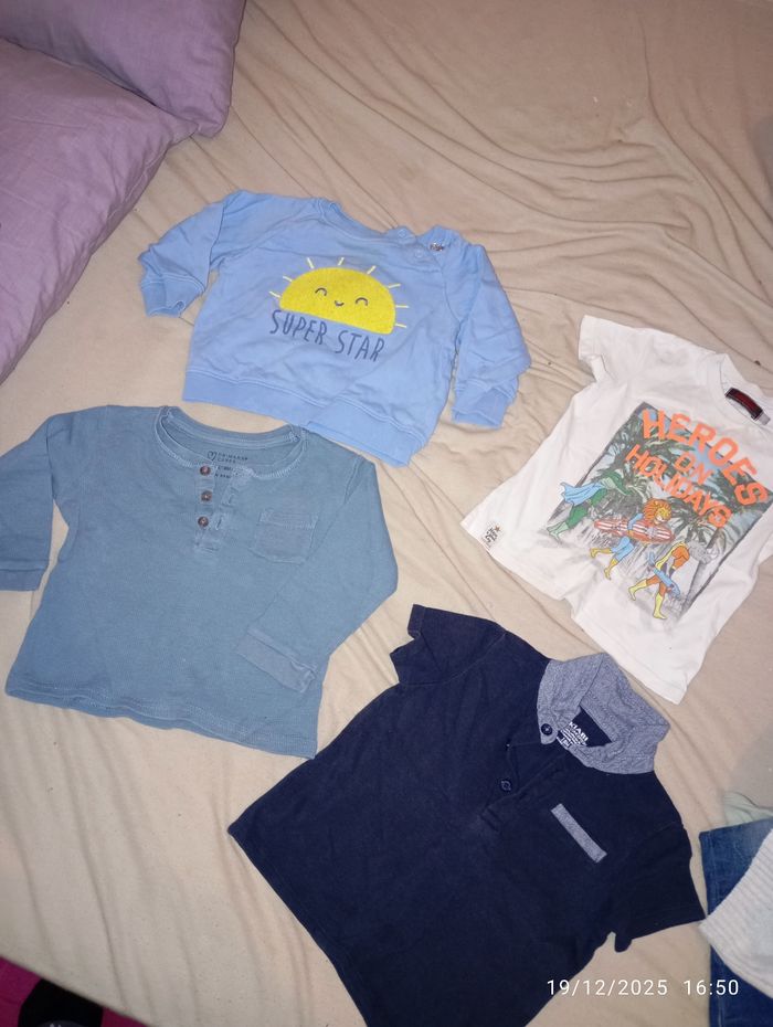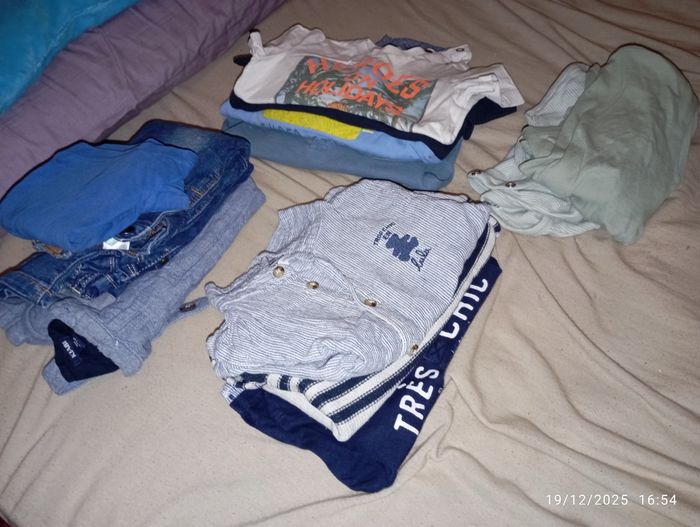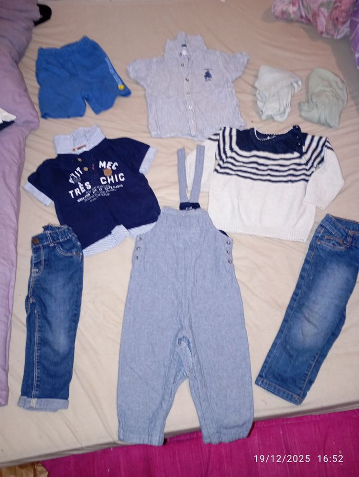 Lot garçon 12/18 mois Dans le lot il a : 2 pantalon jeans très bon état 1 pull 1 combinaison salopette 1 short 1 haut manche longue hivers 1 sweats 2 Tshirt manche courtes 2 chemises manches courtes J'offre avec le lot 2 body manches langues Plusieurs marques Lulu castagnette, kiabi , tex,baby,etc..