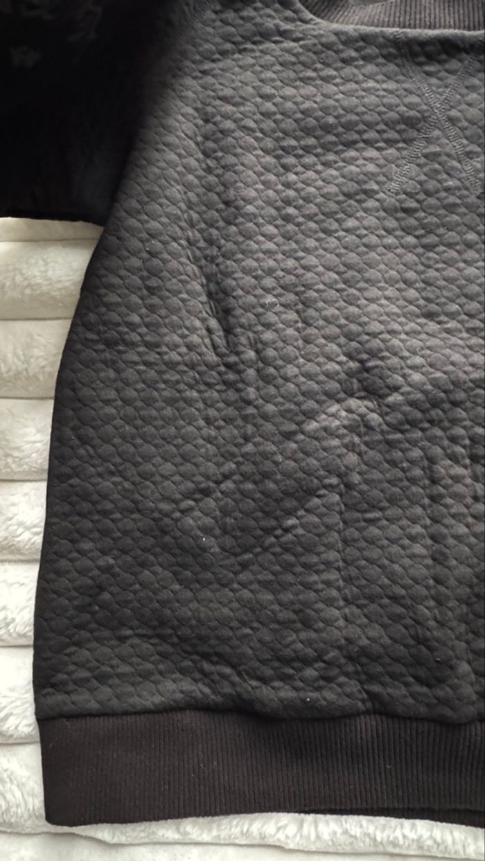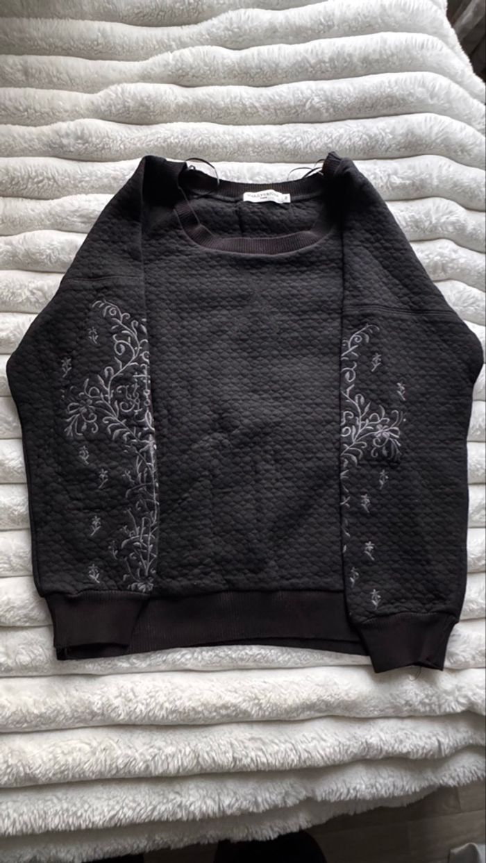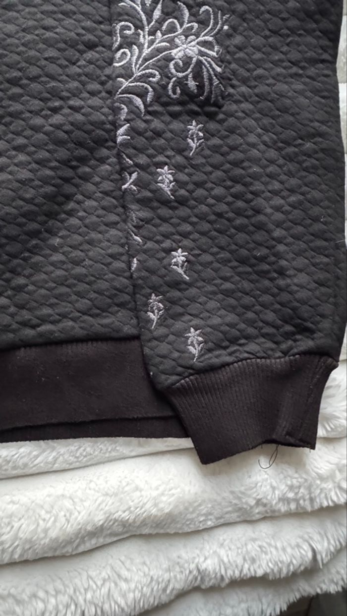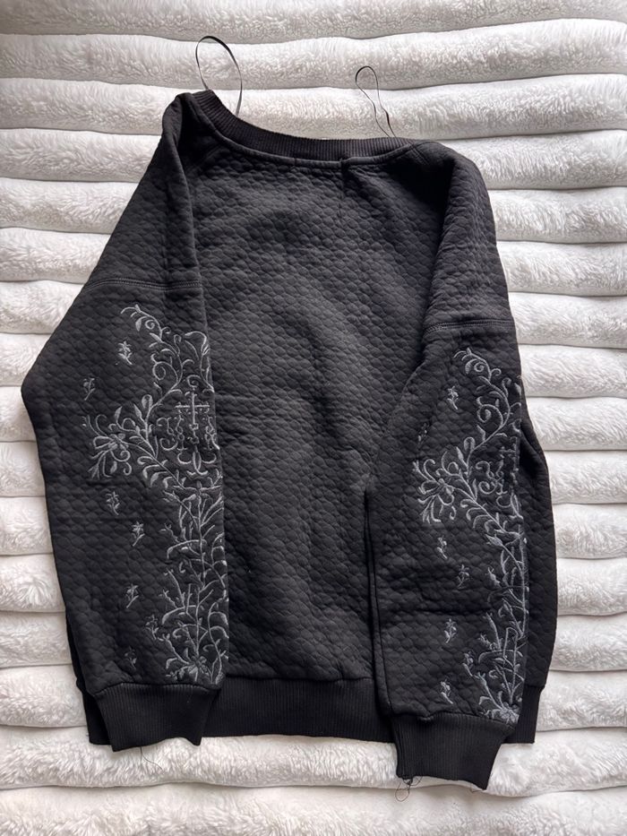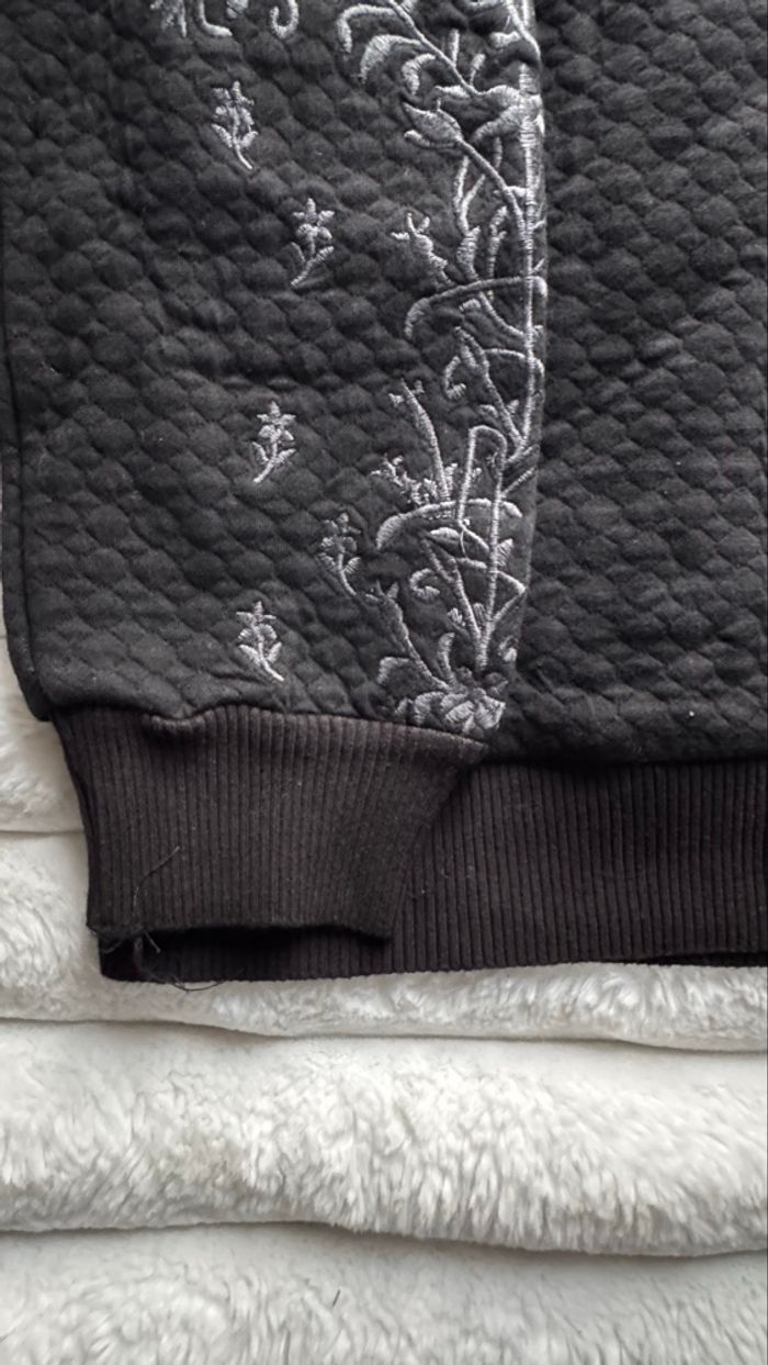 Tissu matelassé noir ultra doux et confortable, avec de superbes broderies florales ton sur ton sur les manches (détails raffinés et élégants, motif fleurs et arabesques). Coupe oversize ample, manches longues, encolure ronde et bas côtelés. Parfait pour un style chic et cosy en hiver ou mi-saison.