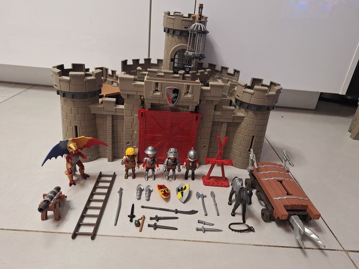 Chateau playmobil 6001 avec accessoires et personnages chevaliers. Un petit élément a été recollé mais cela est à peine visible et ne gêne en rien le jeu ( dernière photo)