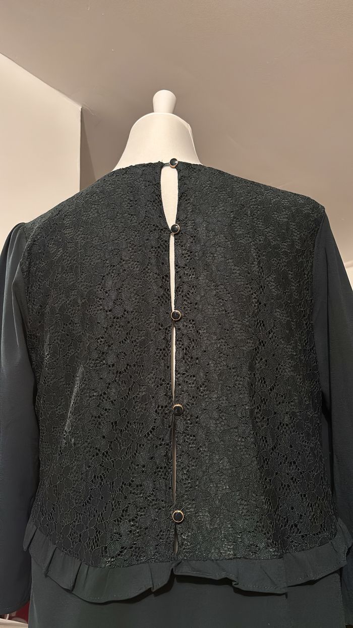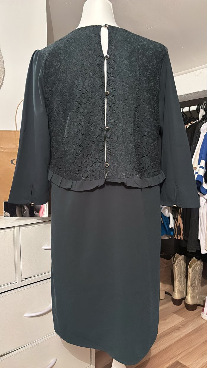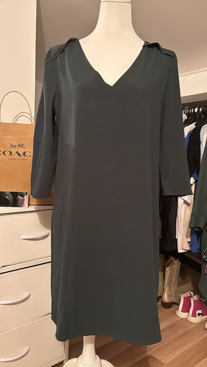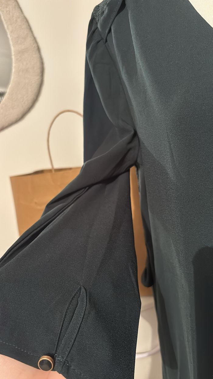 38€, bouton de rechange sur l'étiquette 🪩 Robe verte foncée 💙 Dentelle au dos 📏 Dimensions : longueur 94cm, largeur 50cm 📦 État : Très bon état Matière : 100% polyester 🔹 Décolleté en V à l’avant 🔹 Manches 3/4 avec petit bouton décoratif au bas 🔹 Dos travaillé avec un empiècement en dentelle élégante et une rangée de boutons 🔹 Tissu fluide et léger, doublé sur le corps (non transparent)