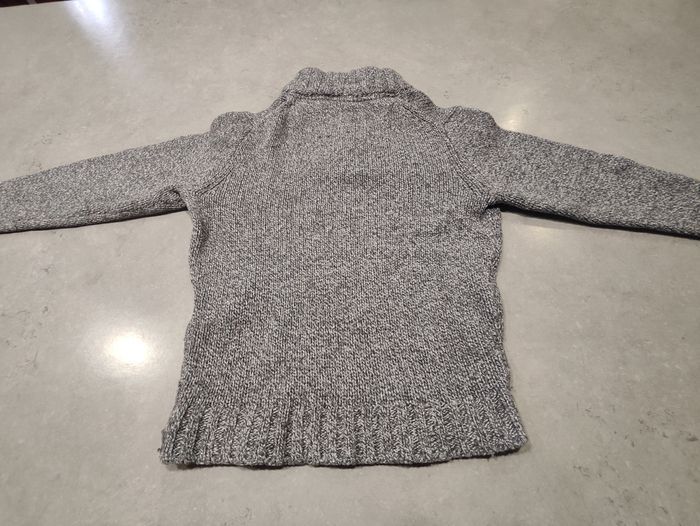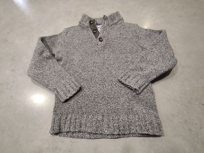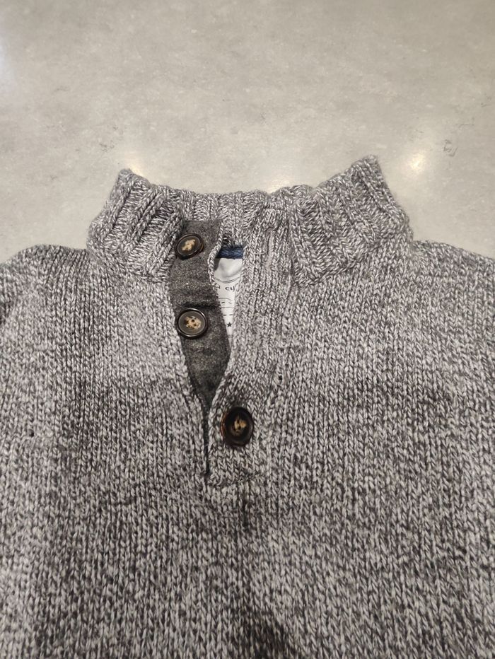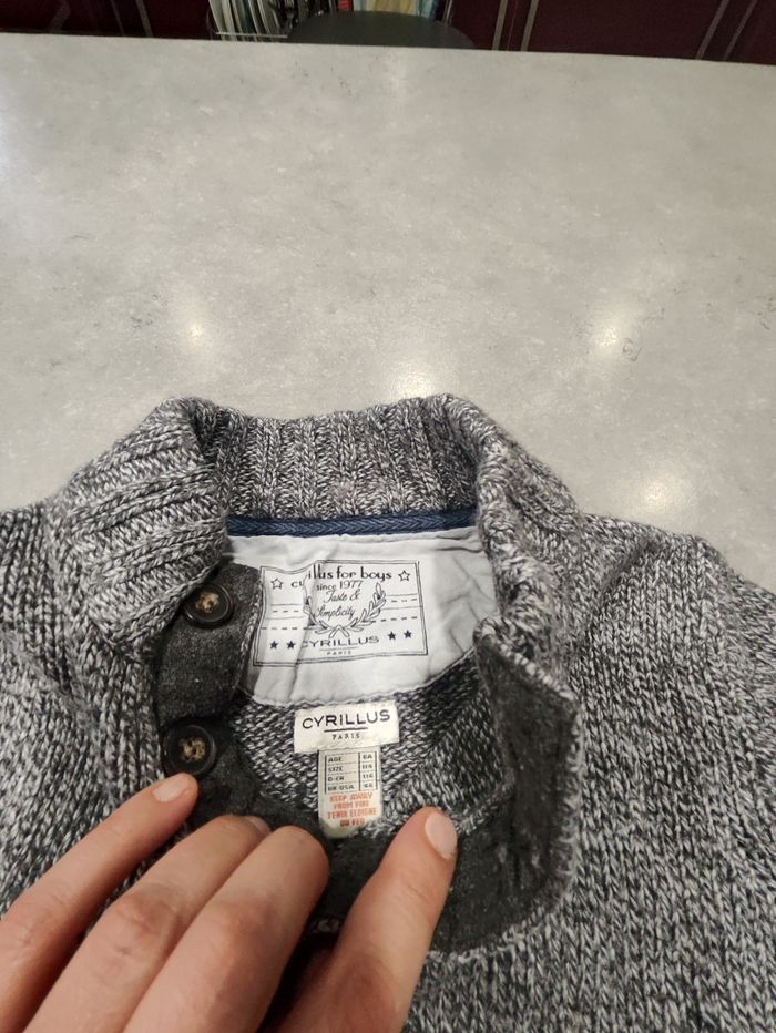 Pull chaud et élégant de la marque Cyrillus, coloris gris chiné, taille 6 ans (116 cm). Modèle à col montant boutonné, idéal pour l’hiver. Maille épaisse État : bon