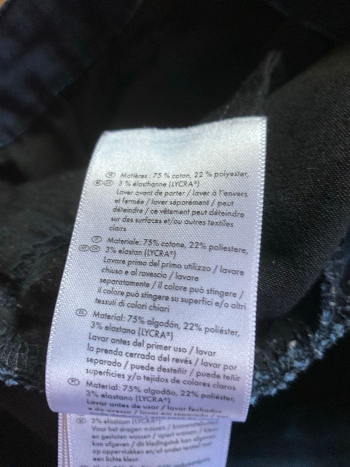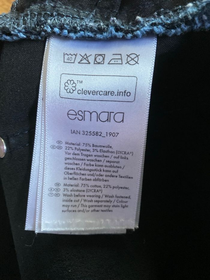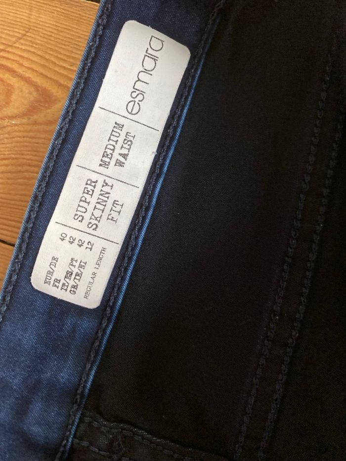 Jeans super skinny fit Taille 40/42 75% coton 22% polyester 3% elasthane Esmara La ceinture mesure à plat sans tirer 38,7 cm, va jusqu'à 46,5 cm en tirant Longueur milieu devant 23,7 cm Longueur entre jambes 76,3 cm Largeur à plat bas des jambes 12,8 cm