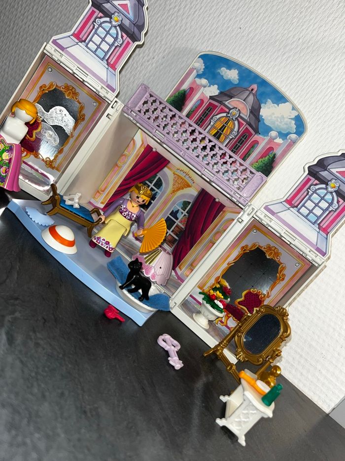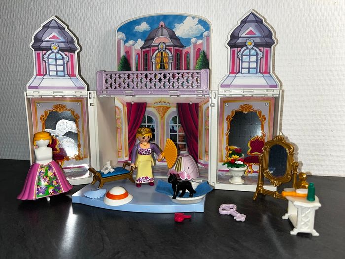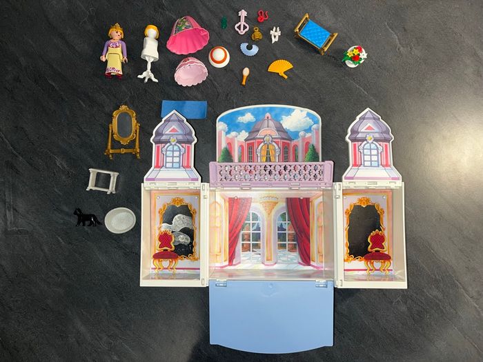 Coffre Playmobil 5419 Palais de Princesse en valisette transportable (modèle pliable), idéal pour le jeu et le rangement. Pratiquement Complet avec quelques articles de couleurs différente de la couleur d origine et une table manquante