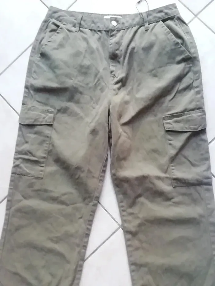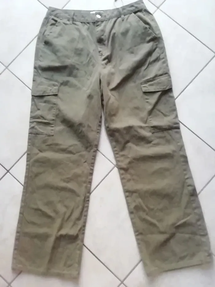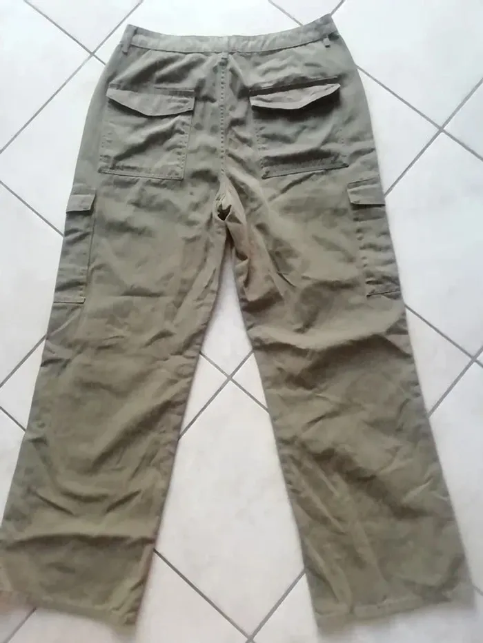 DE COULEUR VERT KAKI. BELLE COUPE LARGE CARGO. NEUF JAMAIS PORTE CAR TROP GRAND ET TROP LONG POUR MOI, NOTE EUR : 44 MAIS GRAND, PLUTOT 44/46 VOIR 46, SELON LA FACON DONT VOUS VOULEZ LE PORTER, VOIR MENSURATIONS CI DESSOUS ET COMPARER AVEC UN VETEMENT DE MEME STYLE QUI VOUS VA BIEN : LONGUEUR : env 111cm. LONGUEUR ENTREJAMBE : env 79cm. LARGEUR BAS : env 27cm. LARGEUR TAILLE A PLAT FERME : env 43cm.