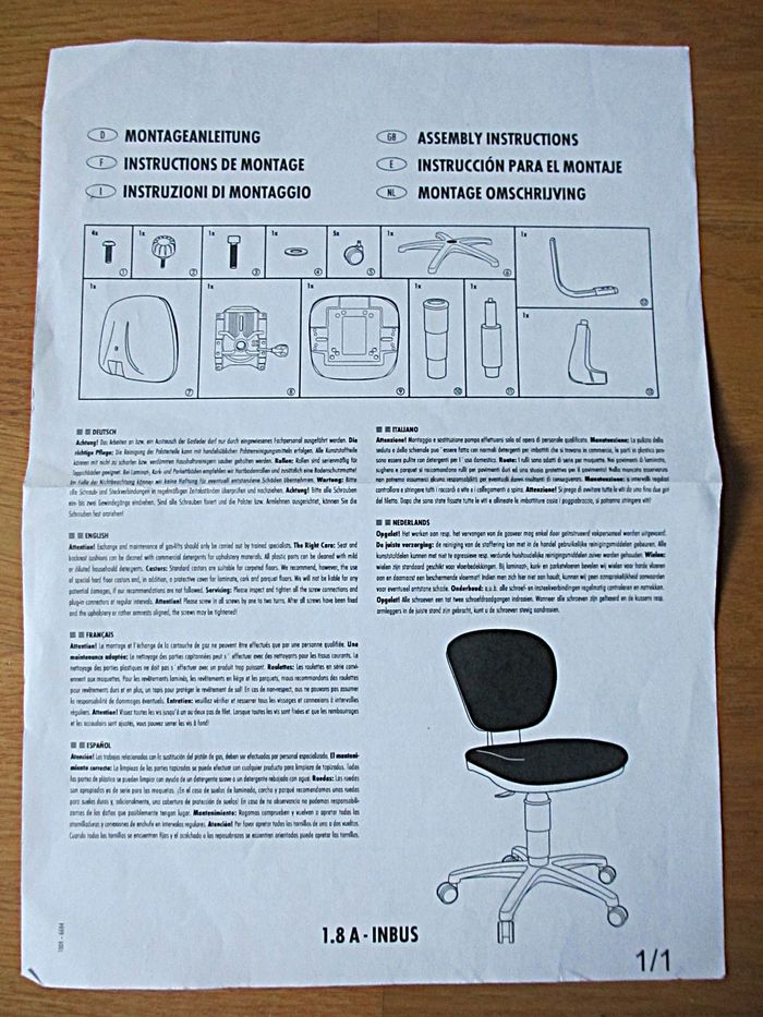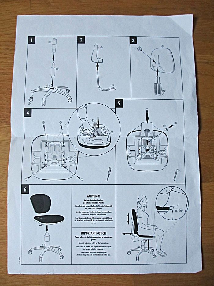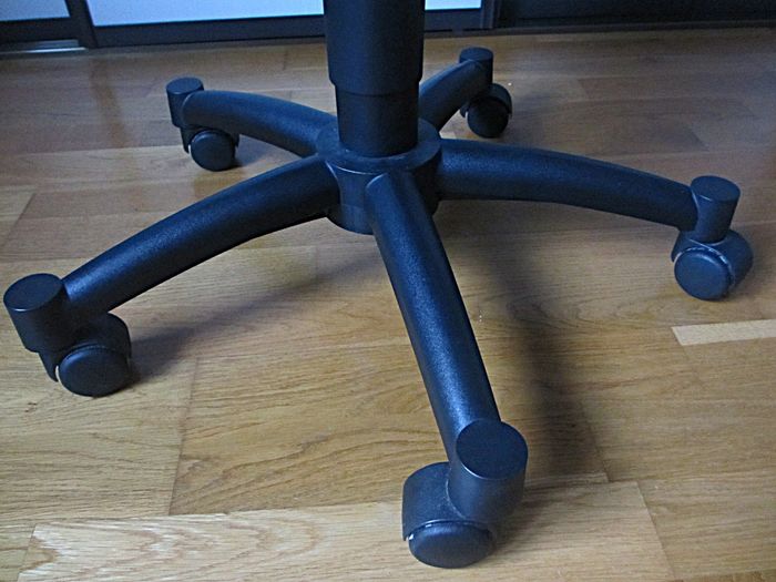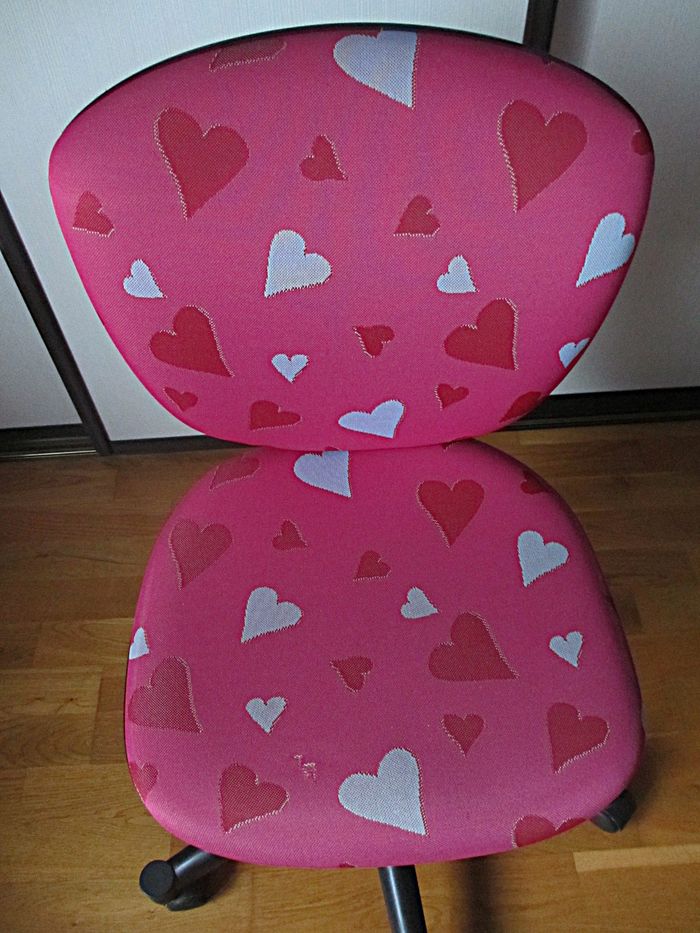Bon état (traces d’usure sur l’assise : légère décoloration et un accroc : voir photos, et les roulettes sont peut-être à remplacer car elles ne tournent plus très bien).