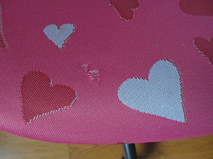 Rose fuchsia avec motifs cœurs gris et rouges.