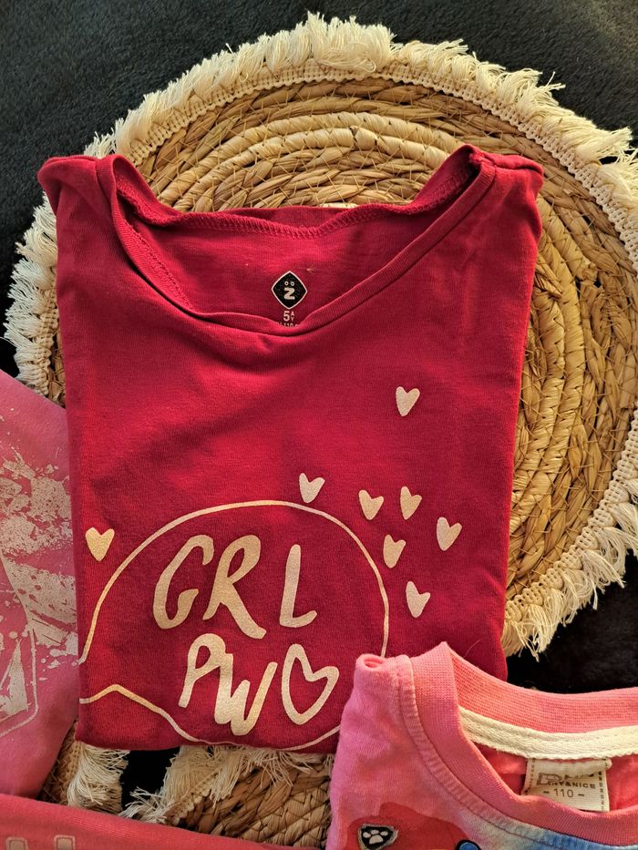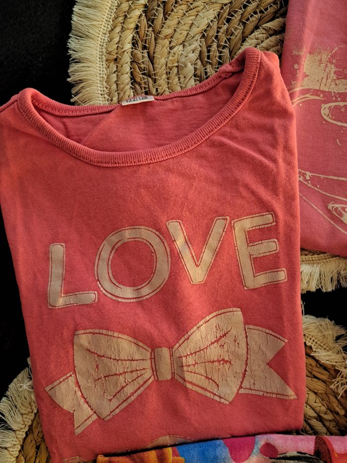 🧸 Lot de 4 tops manches courtes 📏 5 ans / 6 ans 📝 Z 🎨 Rose & Bordeaux 🔺️ Le rose LOVE a le flocage craquelé. Les 3 autres sont en bon état. #pryss31_cinqans #pryss31_sixans