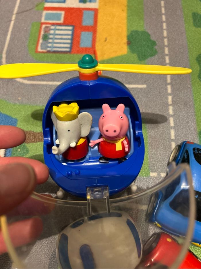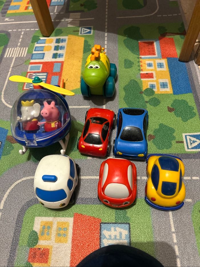 lot de 5 petites voiture dont 2 smoby, un dinosaure roulant de marque playskool et un hélicoptère Peppa Pig avec Peppa Big et Babar que je donne