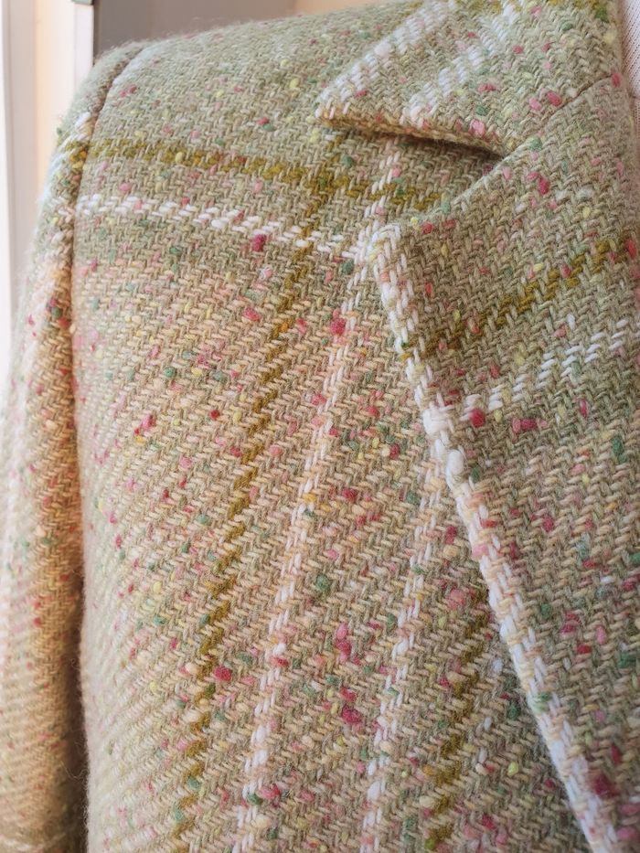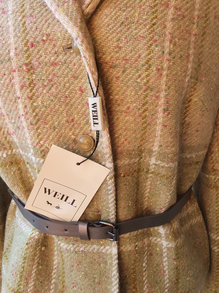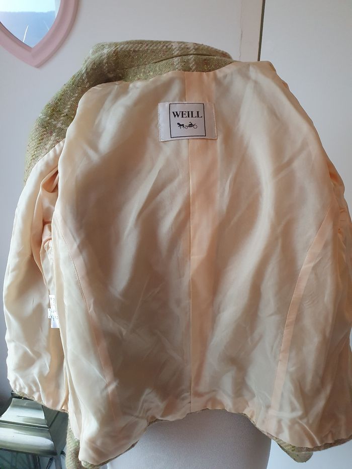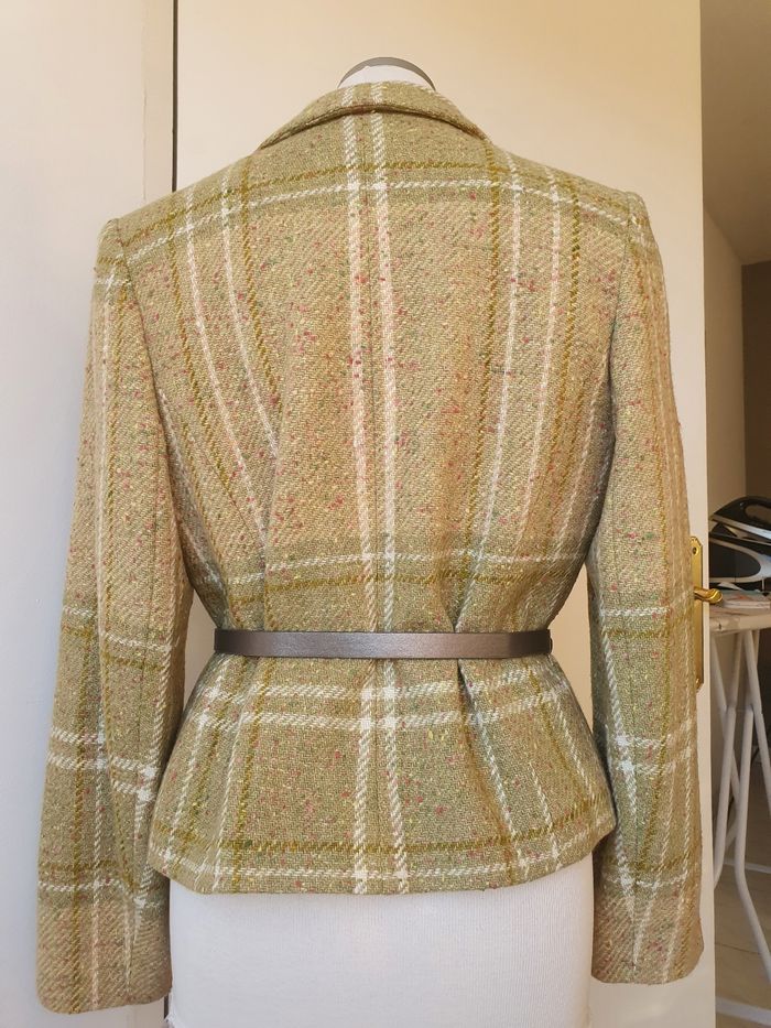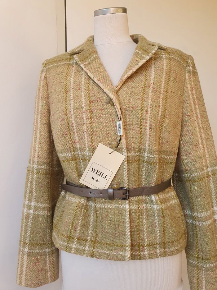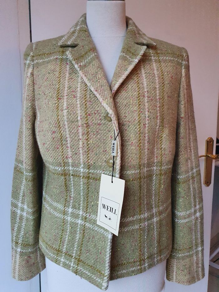 Veste courte à carreaux Prix d'achat : 379 € boutonnée, les boutons sont kaki gravés avec la célèbre calèche de chez Weill. kaki, jaune pâle, blanc et quelques touches de rose. Peut se porter avec un jean ou plutôt habillée selon vos envies. Apporter avec une petite ceinture pour marquer la taille ou pas.