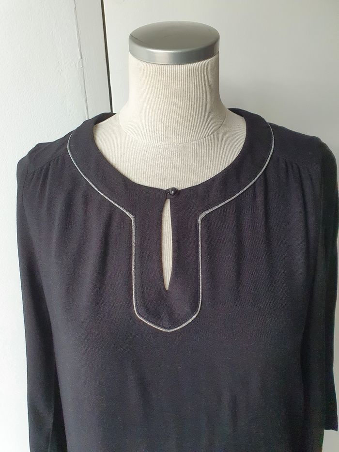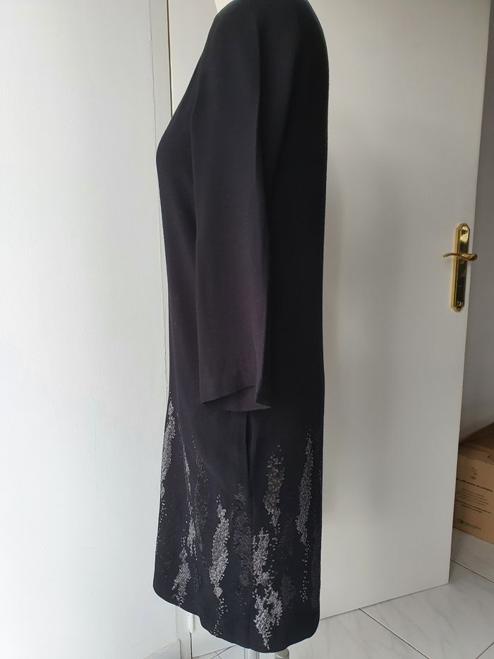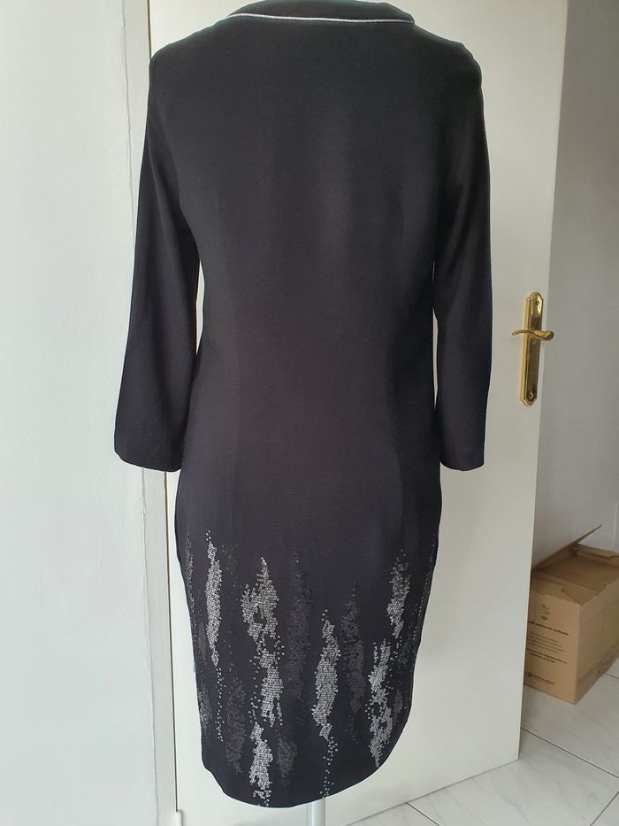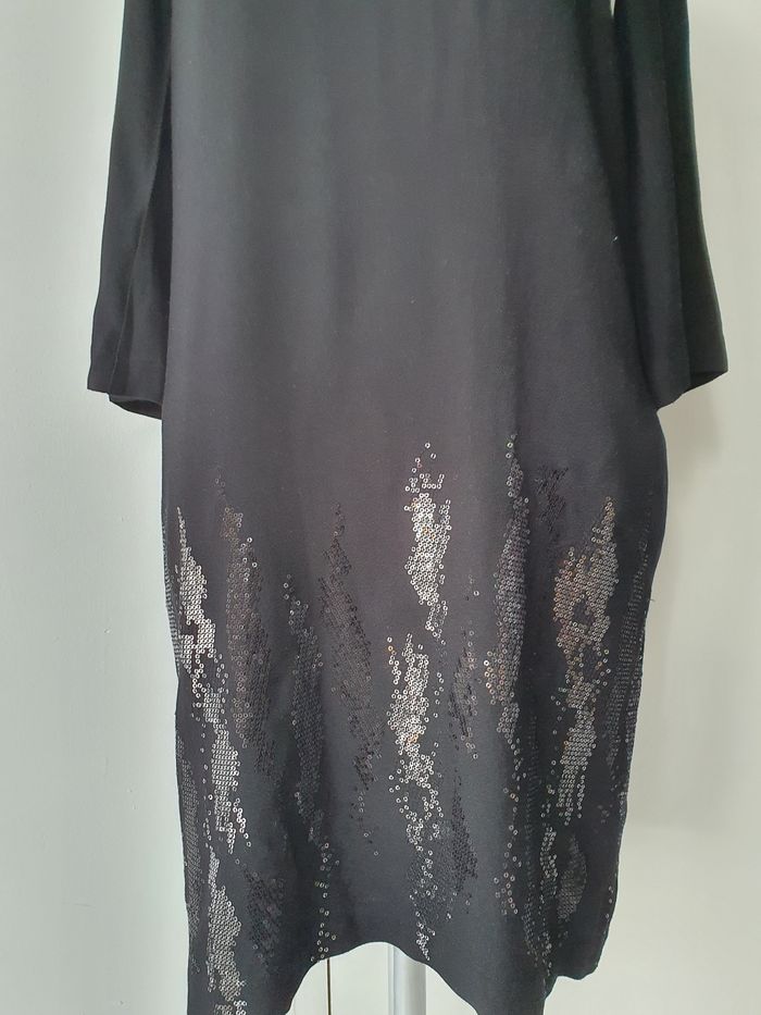 Robe porté 1 fois pour une occasion avec sequins noirs et argents sur la partie basse. Coupe droite, se ferme par un petit bouton au niveau du col et un liseré argenté sur le pourtour. Tissu léger et fluide - manches 3/4