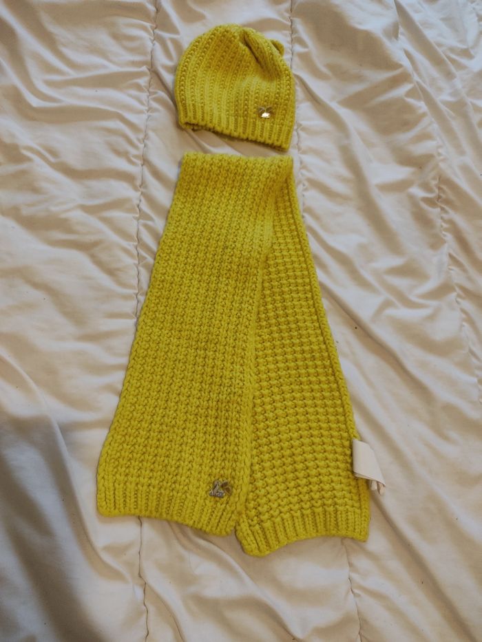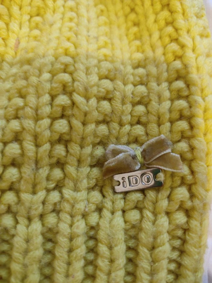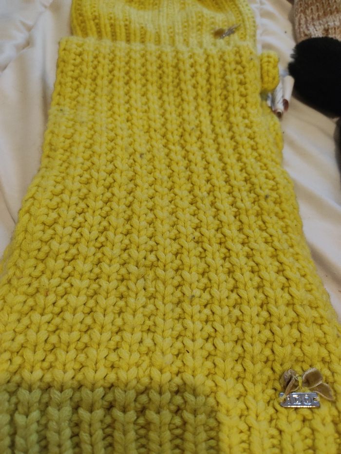 - L'ensemble jaune a quelques bouloches qui peuvent s'enlever, l'écharpe fait 1 metre par 15 cm