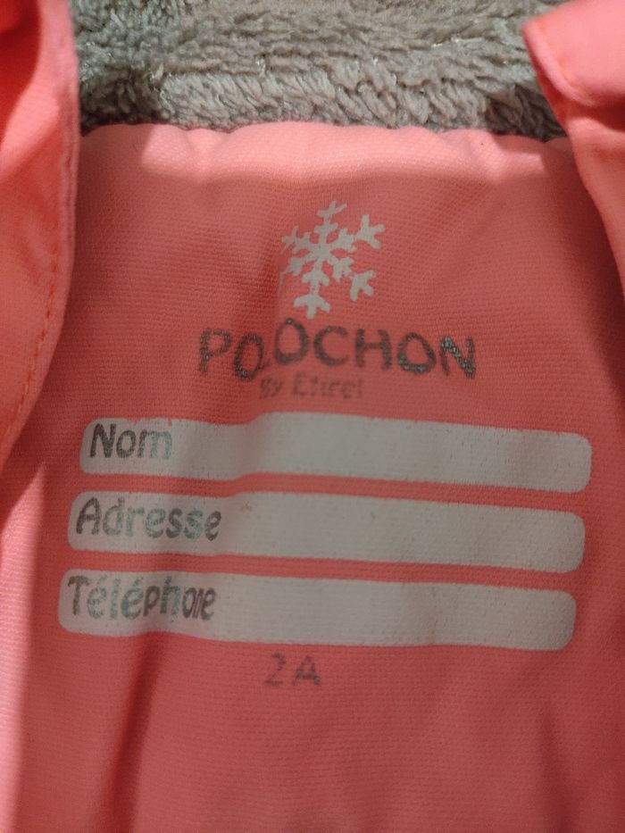 Combinaison intérieur polaire meme aux jambes. Possibilité de mettre sans chaussures et de fermer les extrémités des membres (pieds et mains). Taille 2 ans Marque polochon Une poche devant pour mettre le mouchoir ou autre Donne 2 paires de mouffles avec. Bien regarder le défaut de couleur aux genoux et aux chevilles a cause du sel de déneigement.