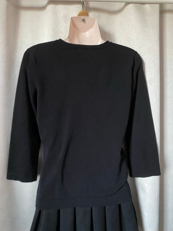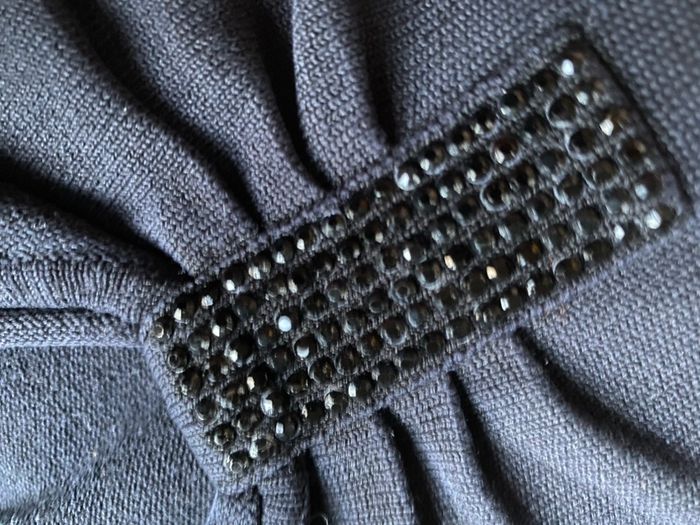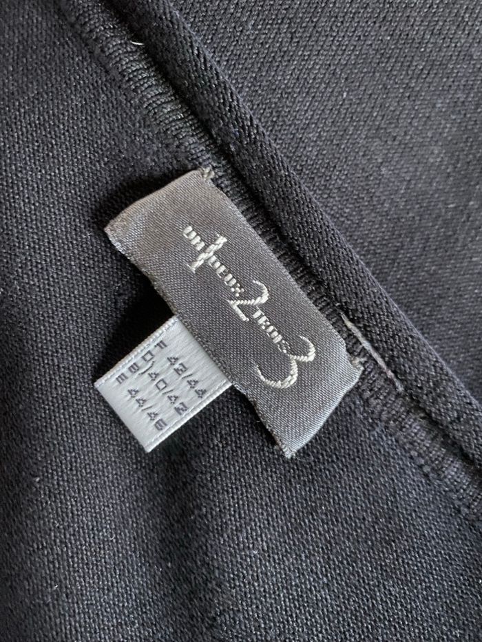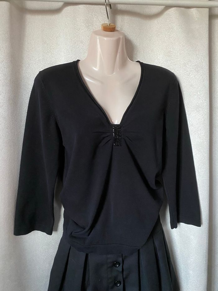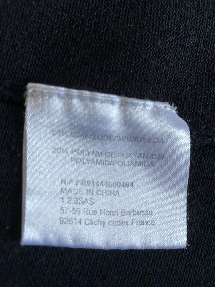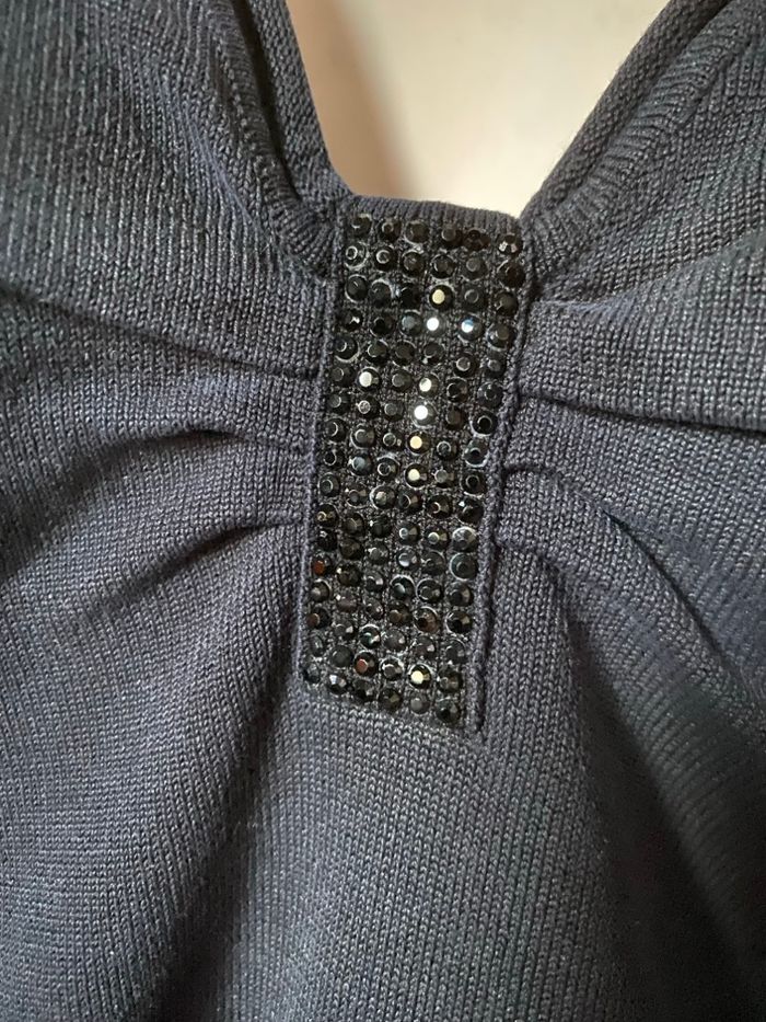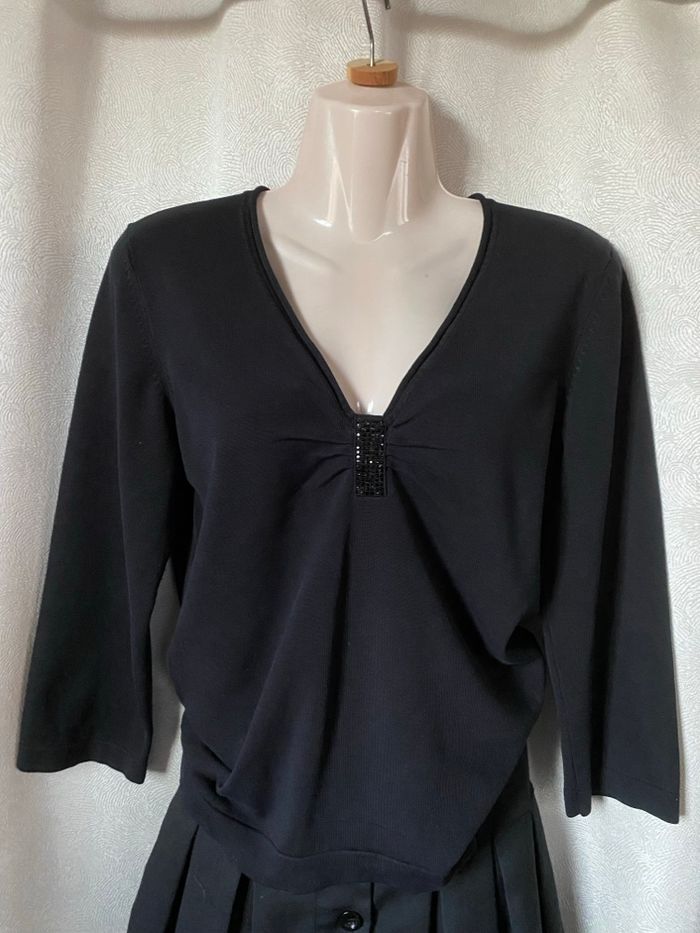Pull léger noir 80% soie 20% polyamide Rectangle strass noirs au creux de l'encolure Manches 3/4 Taille 42/44 maison 1.2.3 Bon état car fil tiré en bas devant Carrure 37 cm Aisselle à aisselle 43,7 cm Longueur dessous de manche 31 cm Longueur 57 cm