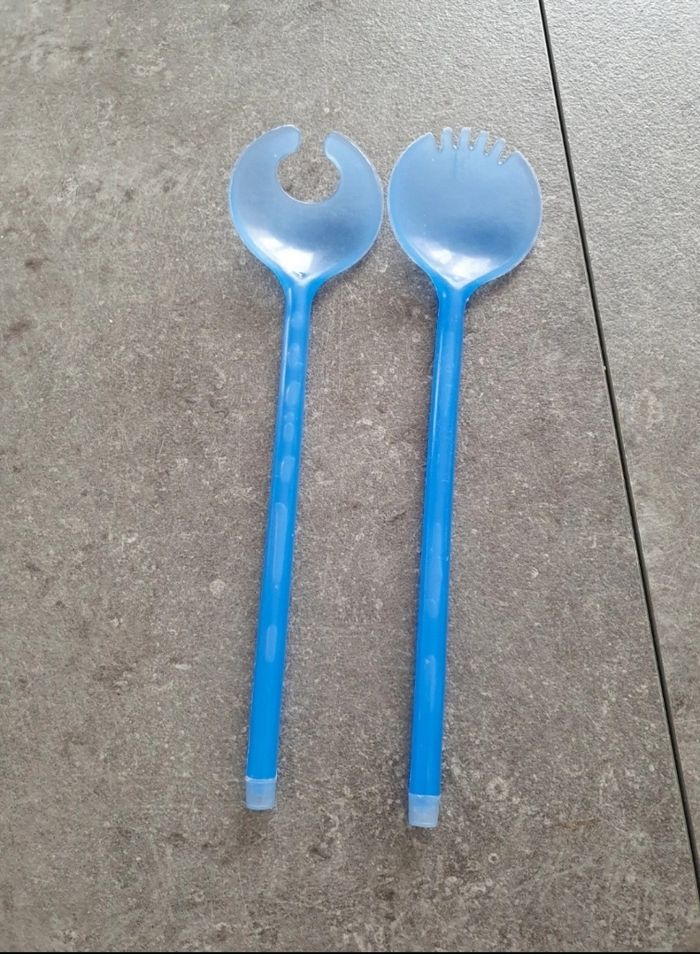 Je vends ce lot de 2 couverts à salade en plastique bleu. En très bon état