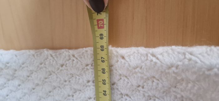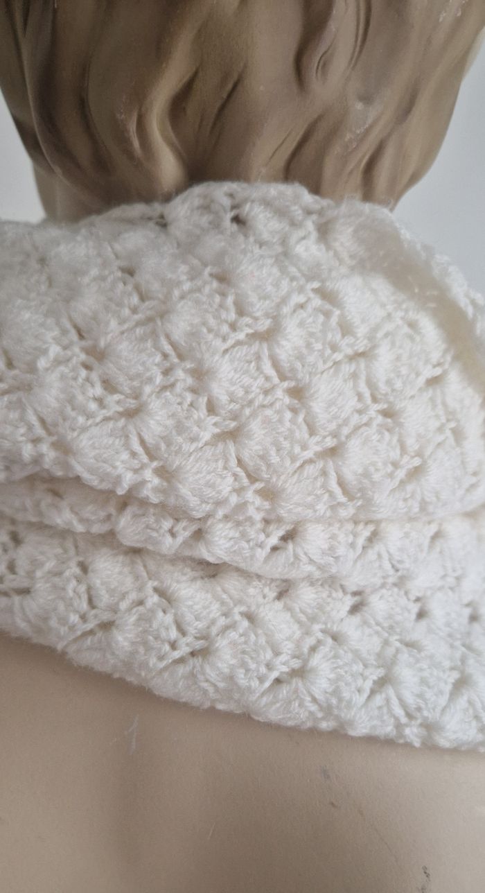 Echarpe à franges grande largeur en laine - Belle longueur également : 136 cm + 2 x 8 cm de franges = 152 cm au total - Largeur 26,5 cm - Coloris blanc - Tricotée main, maille travaillée et originale - Excellent état, probablement neuve, rien à redire.