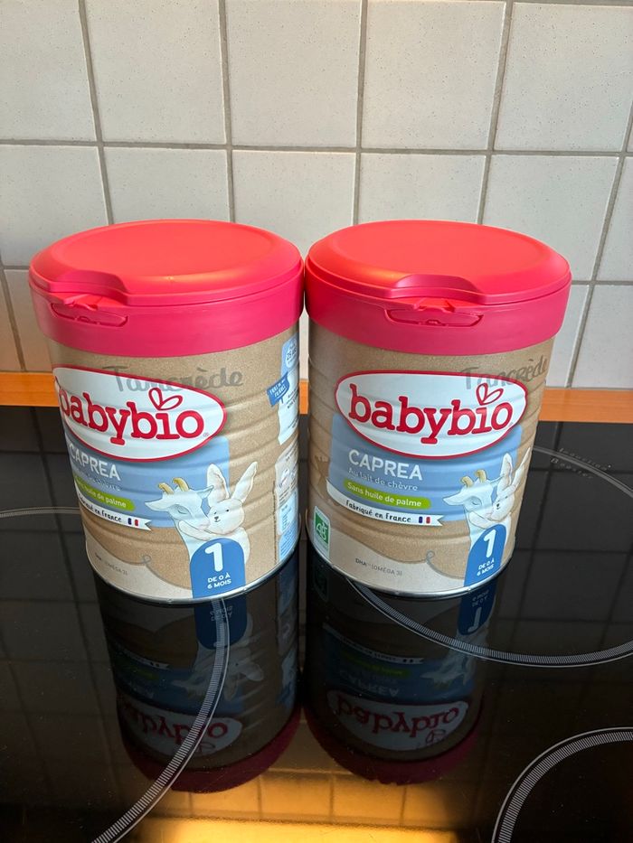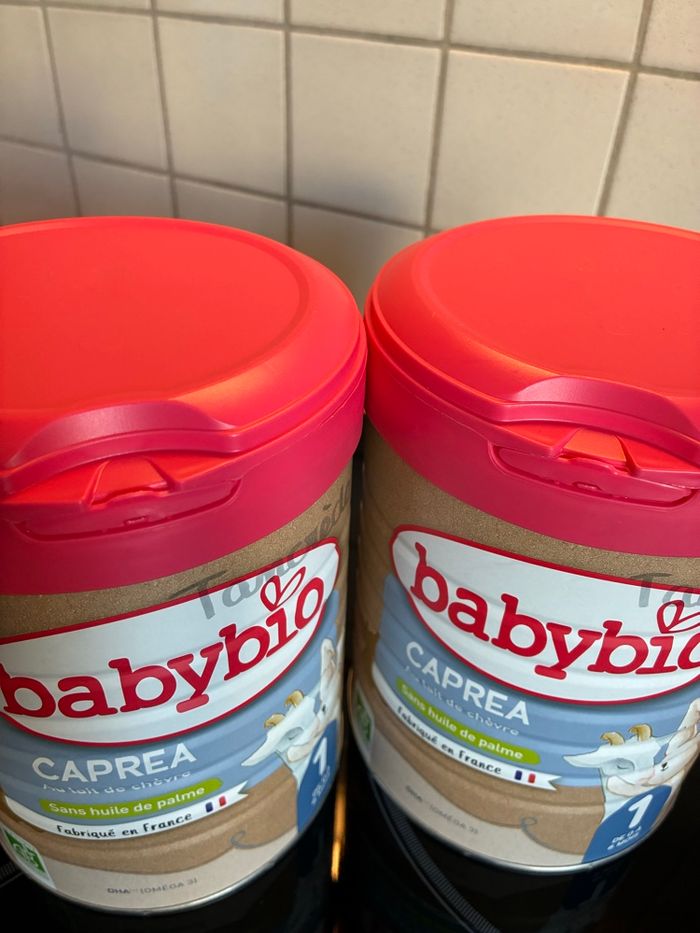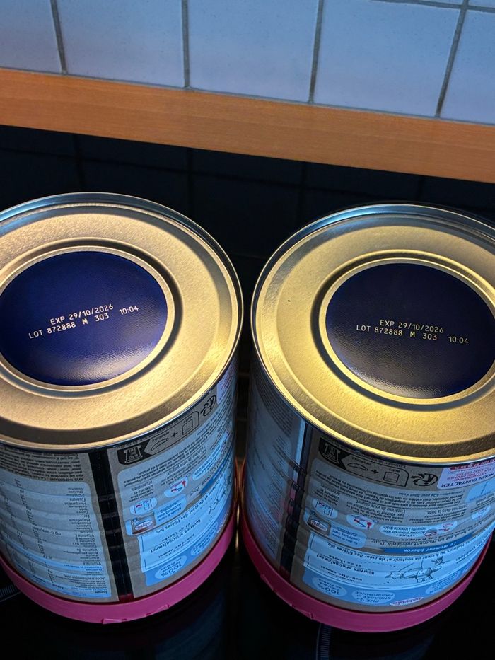 Il y a juste le nom de mon enfant indiqué dessus au marqueur, car ces boîtes étaient pour la crèche, mais j’ai changé de lait entre-temps