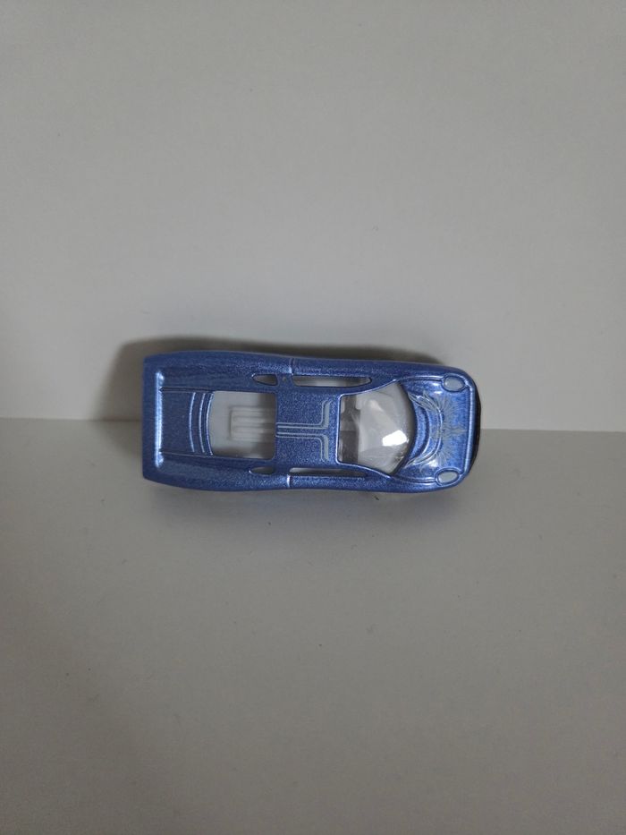 petite voiture de collection de couleur bleue métallisée. Elle présente un design sportif (type Porsche ou GT) et est décorée d'un motif discret de dragon/aigle stylisé sur le capot, ce qui lui donne un look unique.