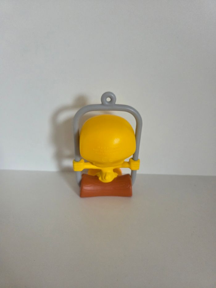 Couleurs: Jaune (Titi), Marron (siège/bûche), Gris (structure de la balançoire)