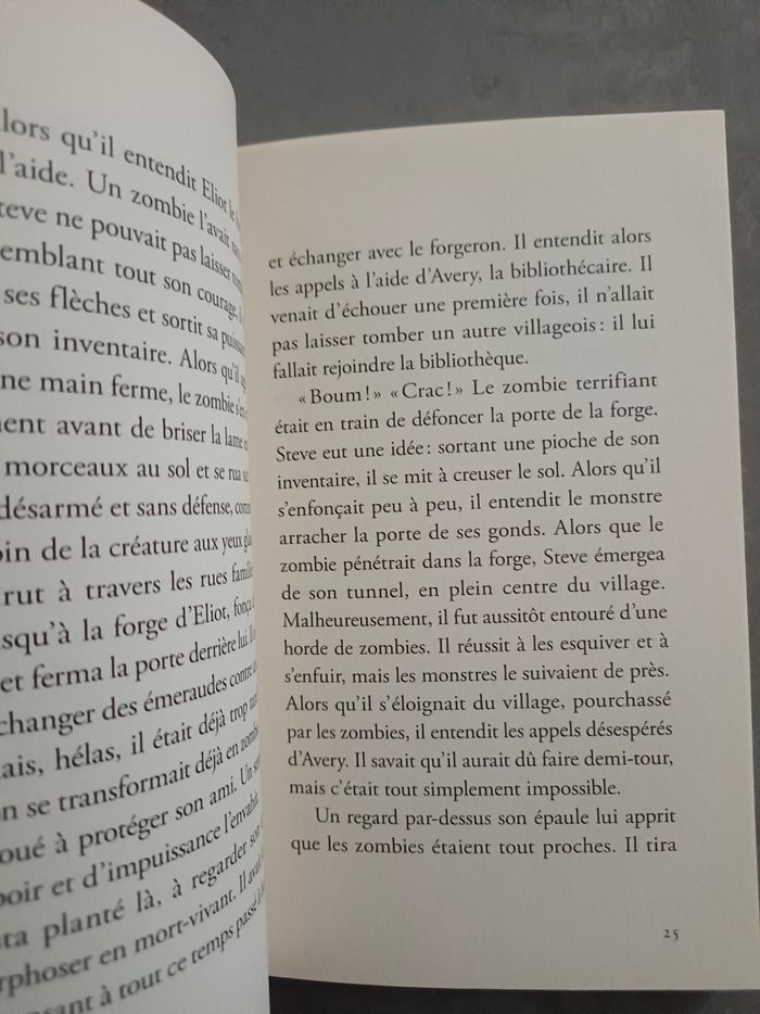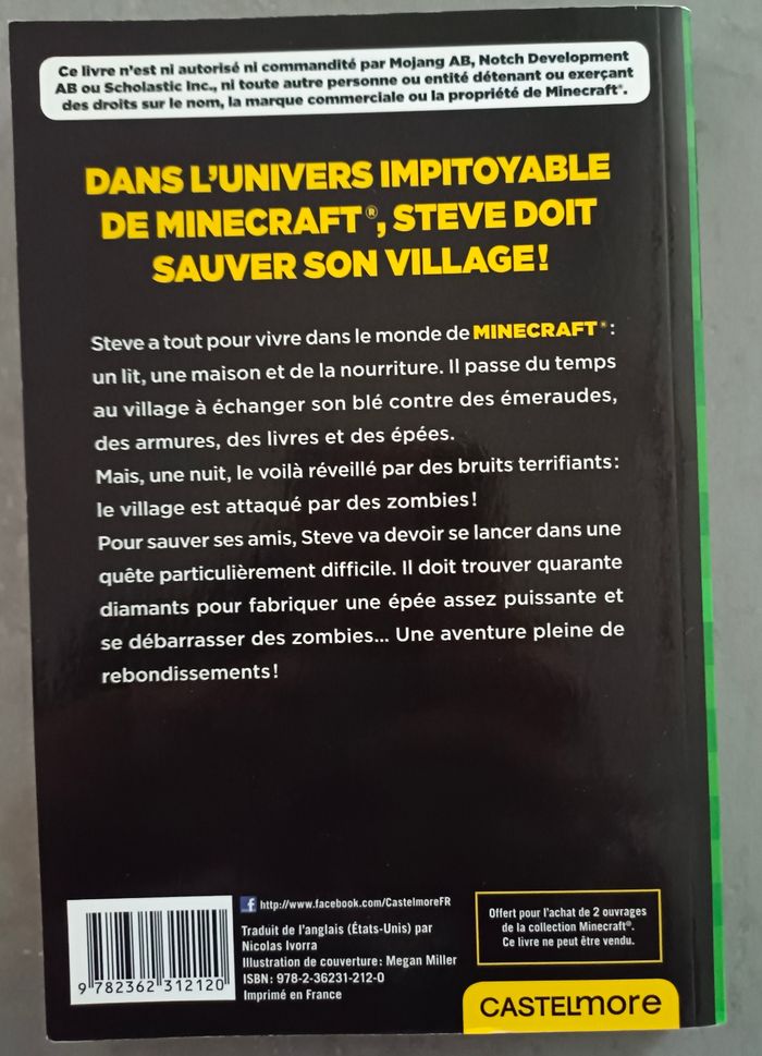 🚨Je n'envoie pas de colis inférieur à 5€ hors frais d'envoi ⛔ Dans l’univers impitoyable de Minecraft ®, Steve doit sauver son village ! Steve a tout pour vivre dans le monde de Minecraft ® : un lit, une maison et de la nourriture. Il passe du temps au village à échanger son blé contre des émeraudes, des armures, des livres et des épées. Mais, une nuit, le voilà réveillé par des bruits terrifiants : le village est attaqué par des zombies ! Pour sauver ses amis, Steve va devoir partir dans une quête très difficile. Il doit trouver quarante diamants pour fabriquer une épée assez puissante et se débarrasser des zombies... Une aventure pleine de rebondissements l’attend ! #livreenfantcamilled974
