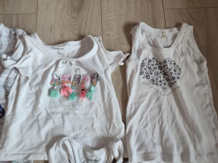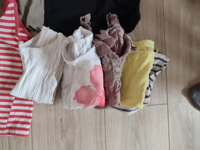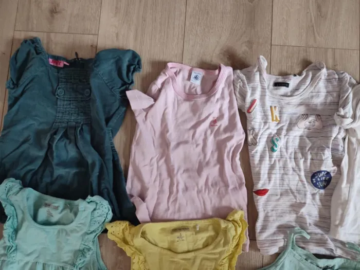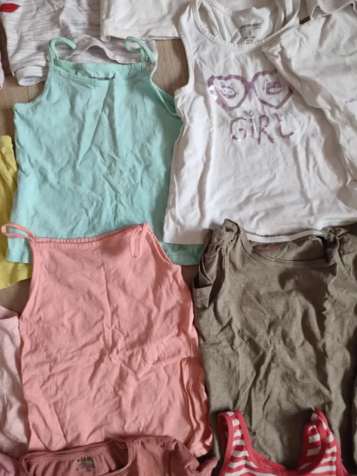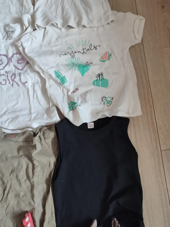 5 ans TB et bon état 19 t-shirts (ikks, orchestra, petit bateau...) + 5 donnés (dernière photo) 20 euros Panachage possible, prix à définir suivant ce que vous me demander mais le prix de lot sera toujours moins cher que l'unité Ex : un ensemble bas+haut je fais en général à 3,20 euros. D'autres article petits prix dans mon dressing Réduction lot activée