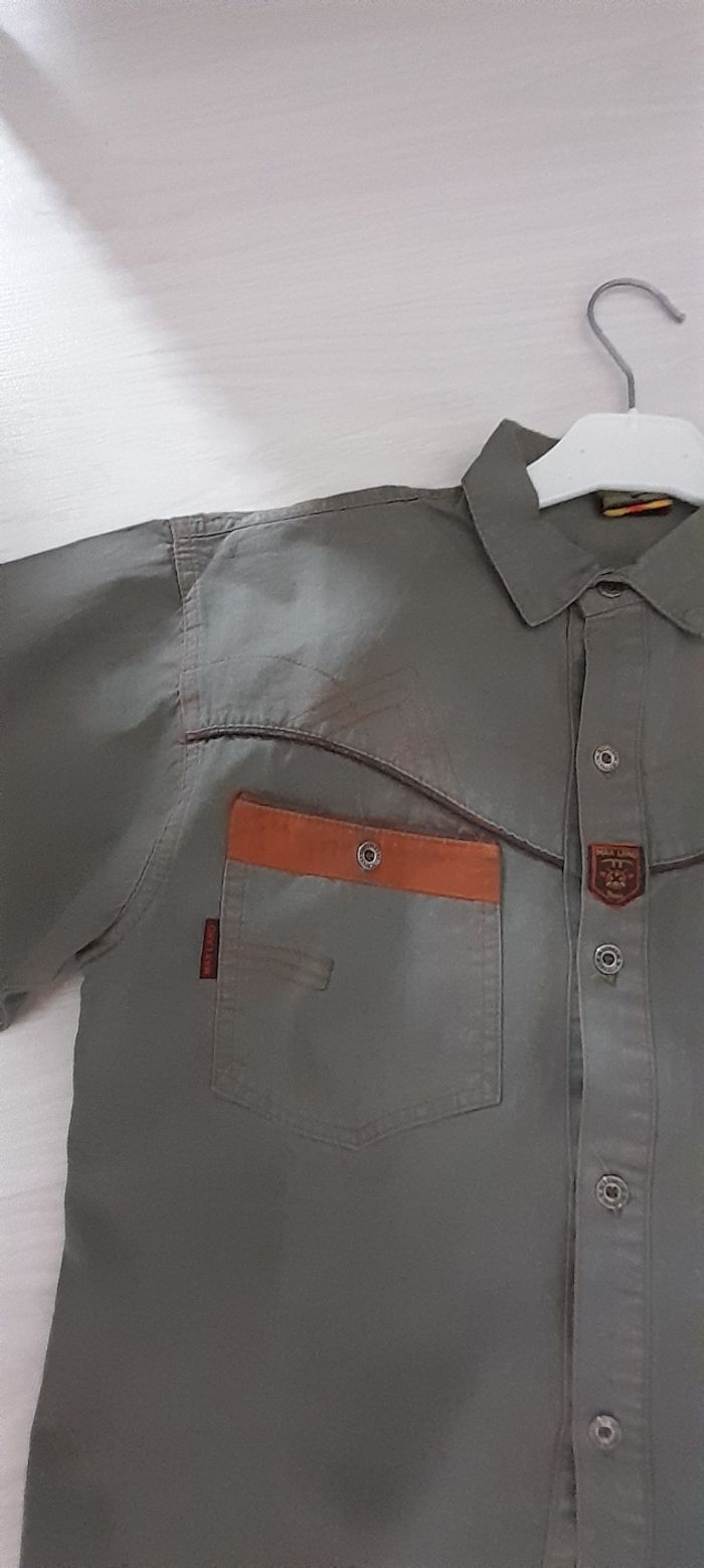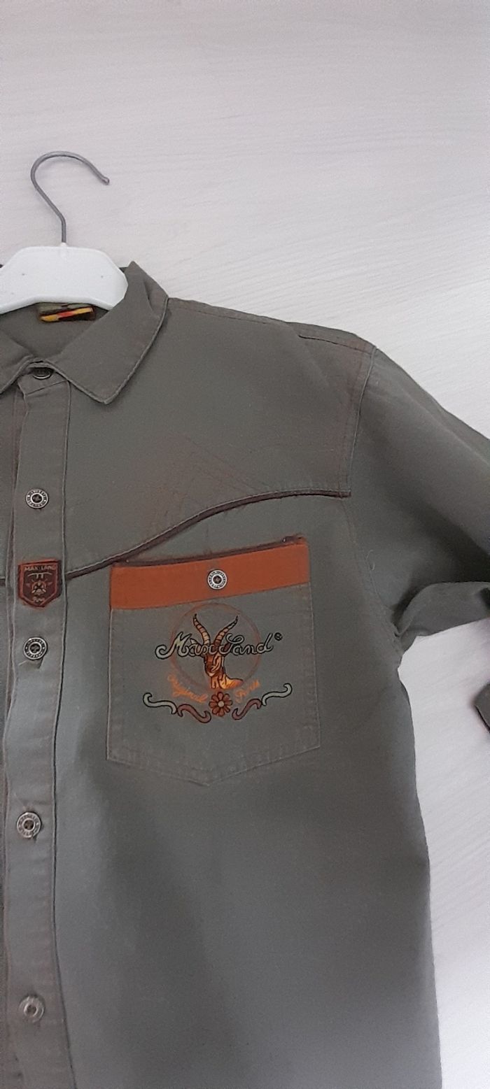 Chemise T 12 ans Marque MAX LAND Couleur kaki et marron Manches longues Attache central boutons 2 poches poitrine dont 1 avec broderie 100% coton Très très bon état