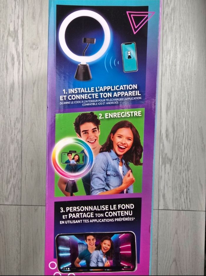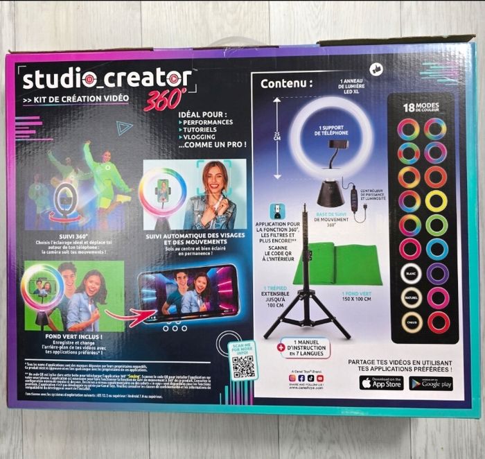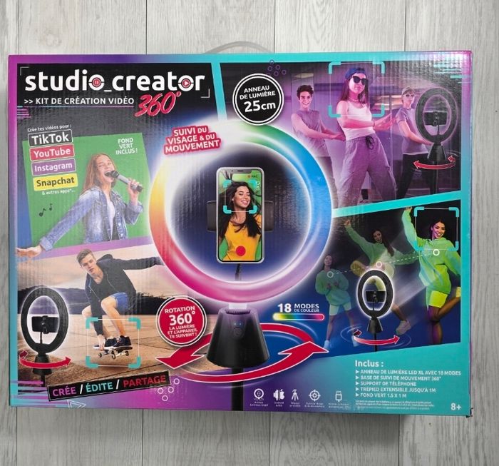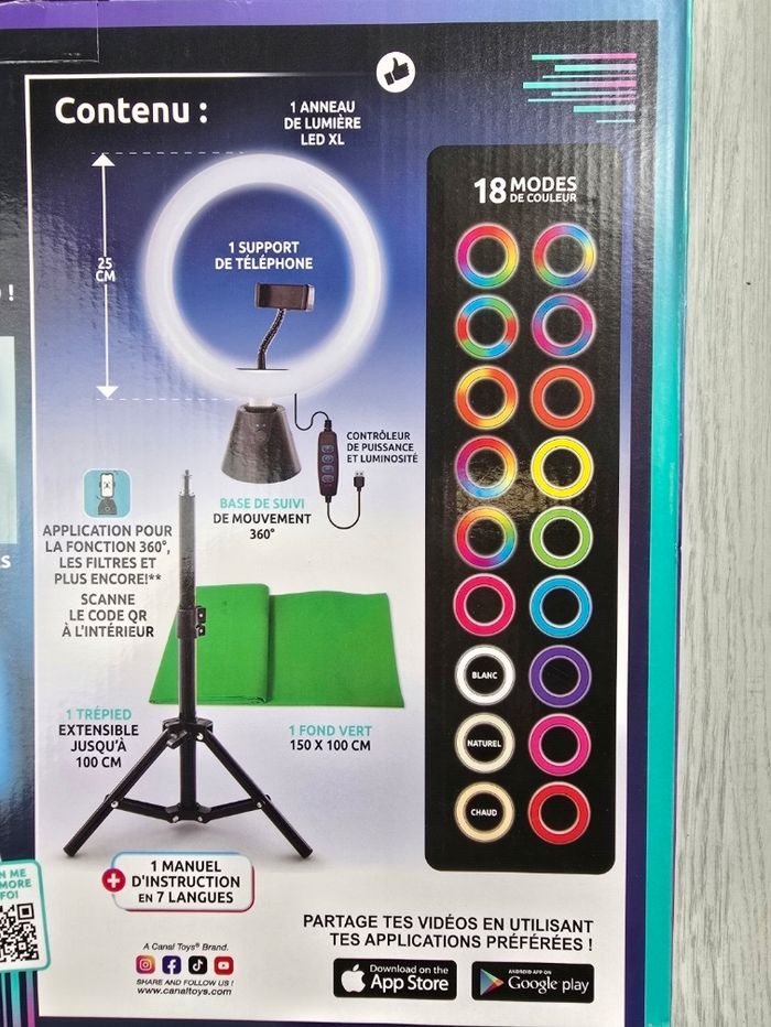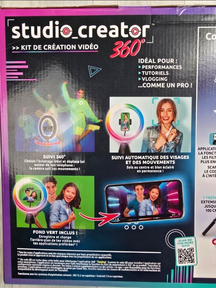 Studio de création vidéo complet signé Canal Toys. Idéal pour filmer, créer et s’exprimer comme un vrai créateur de contenu. Grâce à l’écran vert, au suivi automatique du visage et des mouvements, et à l’anneau lumineux, l’enfant peut réaliser des vidéos dynamiques et créatives en toute simplicité.