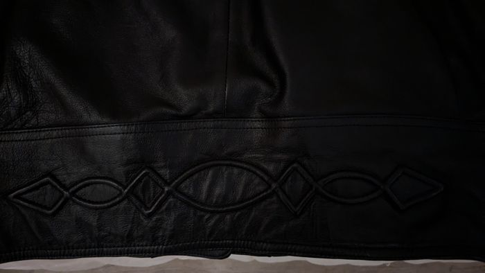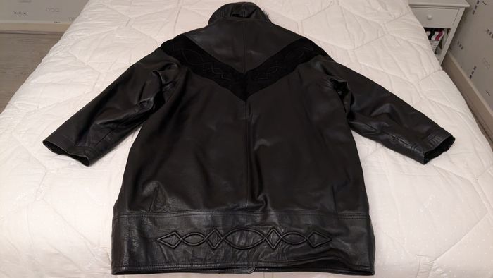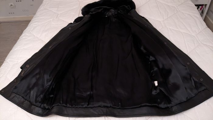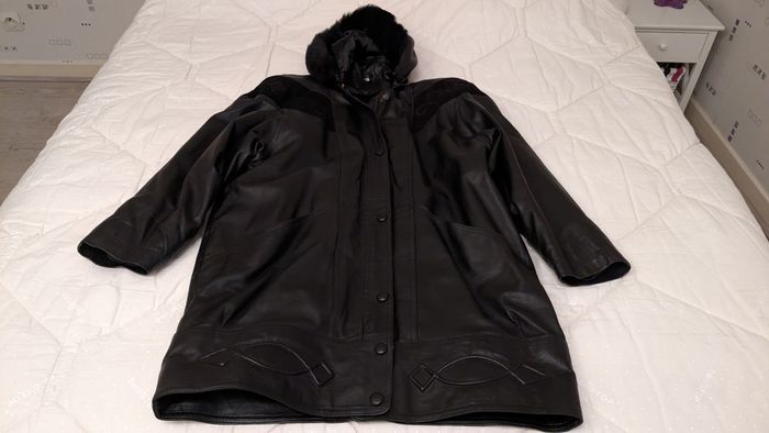 Grande veste à capuche (avec fausse fourrure autour de la capuche), noire, en cuir agneau pleine fleur, pigmenté, avec grandes poches plaquées devant (intérieur des poches à recoudre), fantaisies devant, dos et bas de la veste, pas de marque, doublure 100% viscose. Longueur totale (sans la capuche) 90cm, largeur sous-bras 59cm, largeur épaules 62,5cm, longueur manches 40cm sous la bande noire et 50cm au-dessus de la bande noire et 58cm de l'épaule au bas de la manche.