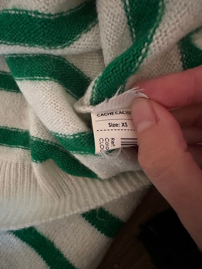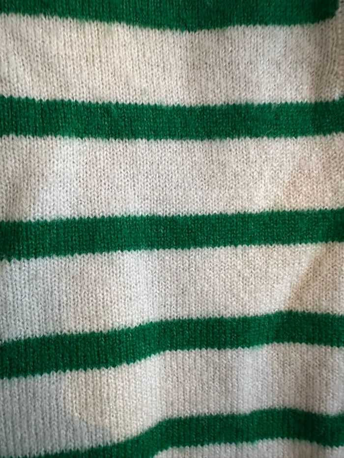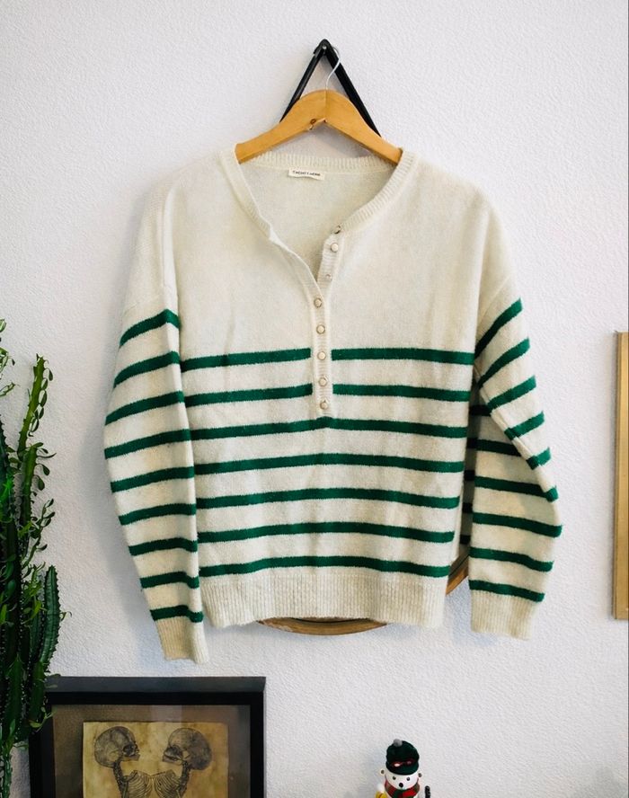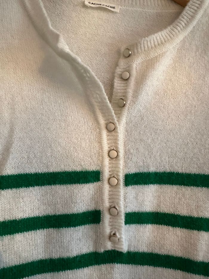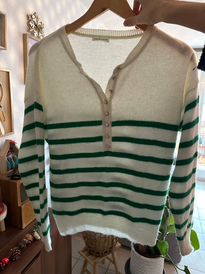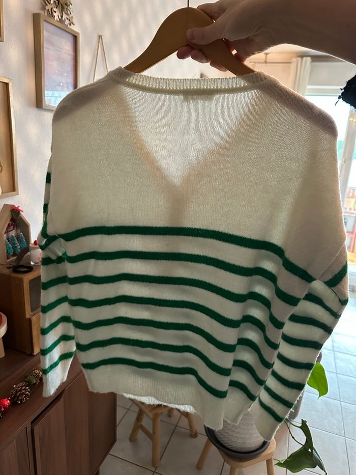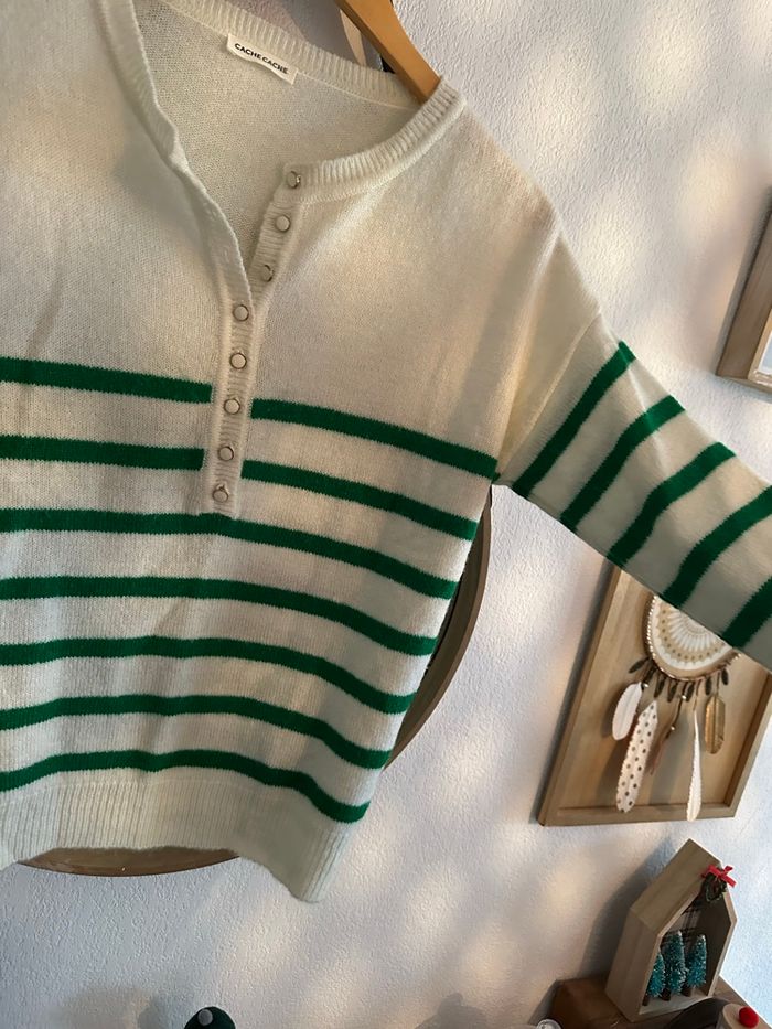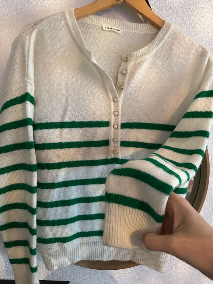 Joli pull en maille douce couleur écru, rehaussé de rayures vert sapin pour un style à la fois intemporel et tendance 🌿